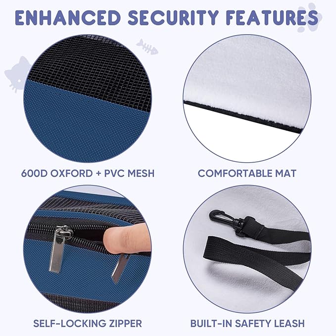 - Durability and Comfort: Made of 600D waterproof fabric and PVC mesh, this pet carrier for cat resists daily wear and scratches from pets; The integrated iron wire and rubber frame maintain its shape even when empty; While the 3mm fiberboard base offers stability, and a removable soft plush mat ensures a comfortable sleeping space for your pet during trips