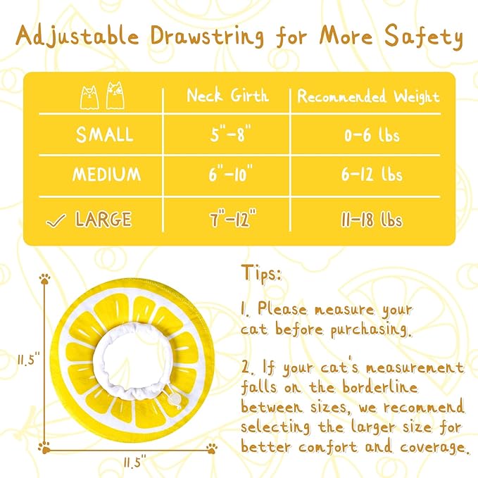 - 【SUITABLE FOR ALL SIZE OF CATS】 Soft cone for cats has an adjustable inner, so you can make a comfortable fit for your cat. By adjusting the stretchy string, cat won’t slip out of it that easily. Available in three sizes. Size L (11.5"×11.5") suitable for cats with a neck circumference of 7-12 inches (11-18 pounds cats recommended).