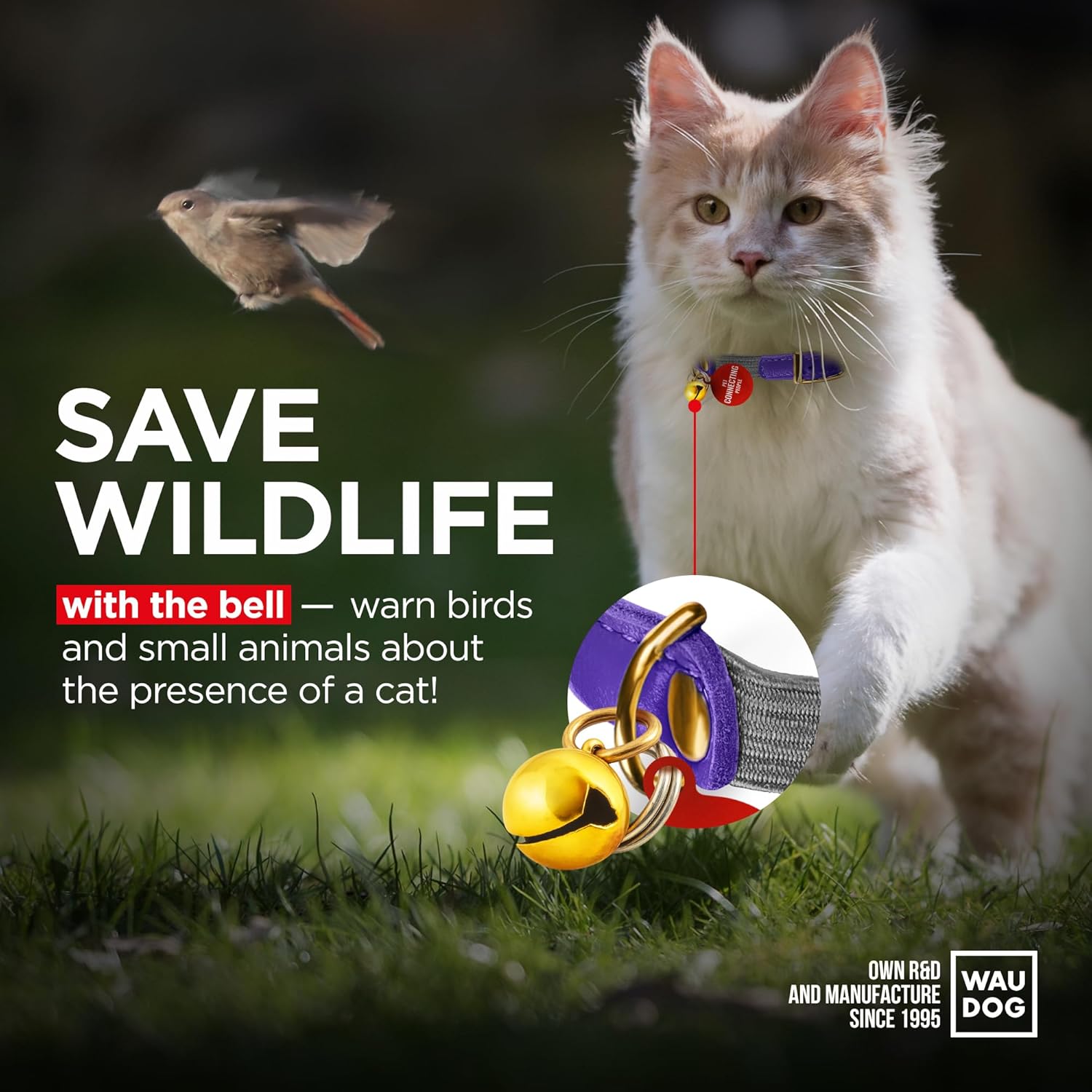 WAUDOG Ultra Soft Rolled Leather Cat Collar with Removable Bell, Safety Elastic Strap and QR ID Tag - Soft Padded for Small, Medium, and Large Cats - Round Kitten Collar for Male and Female Cats