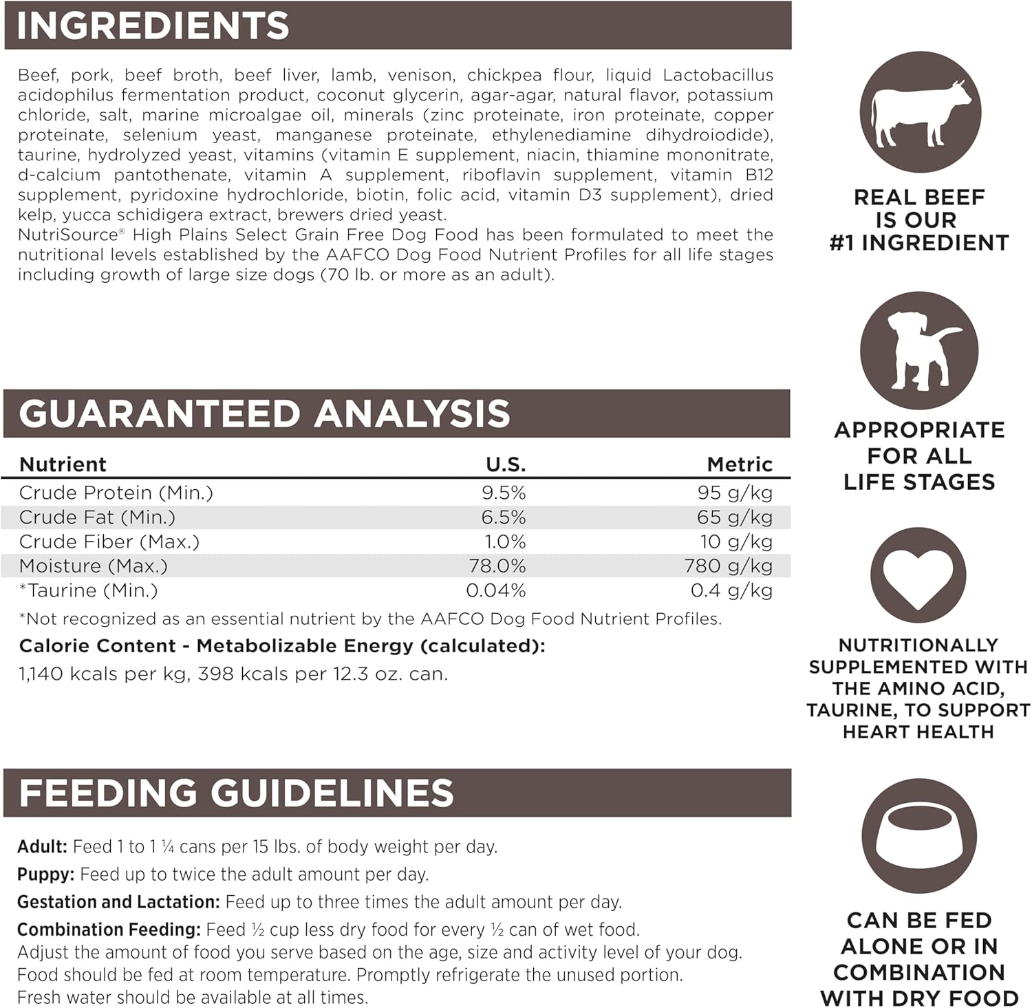 - PREMIUM INGREDIENTS- NutriSource canned dog foods always feature real meat as the #1 ingredient. Our Grain Free High Plains Select recipe is a protein heavy, low carbohydrate diet suitable for all dogs