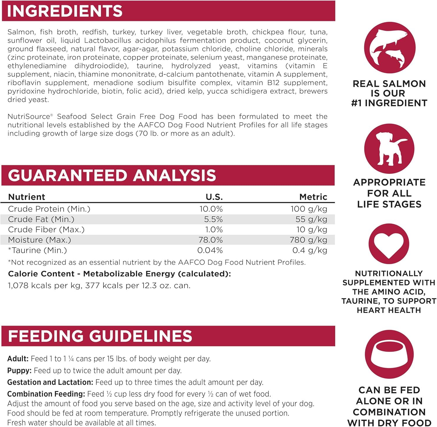 - PREMIUM INGREDIENTS- NutriSource canned dog foods always feature real meat as the #1 ingredient. Our Grain Free Seafood Select recipe is a protein heavy, low carbohydrate diet suitable for all dogs