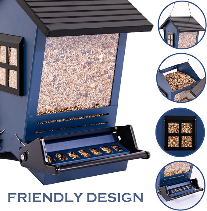 - 【ROBUST DESIGN】: Our Squirrel Proof bird feeders for outdoors hanging features 2 ports on either side of the feeder, designed specifically for birds to peck at seeds. Crafted from robust metal and complemented with transparent, hard polycarbonate panels, this wild bird feeders for outdoors hanging is virtually squirrel-proof, as these critters struggle to gnaw through. The metal parts are treated with a rust-resistant, matte powder coat finish, and the roof provides shelter from rain and snow.