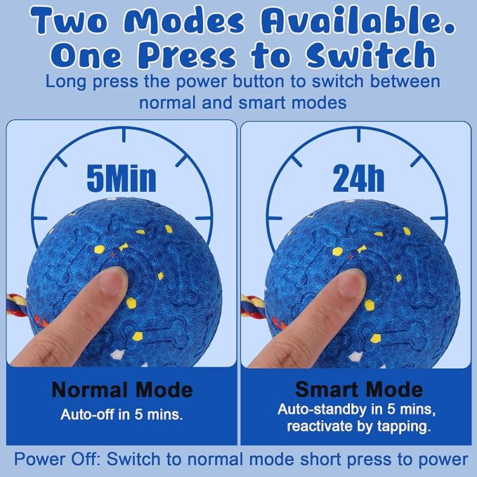 - 【Intelligent Interaction and Fun】: This automatic dog toy is your pet's new playmate. It has two modes: Normal mode (green light), which runs for five minutes and then automatically shuts off. Intelligent mode (blue light), after running for five minutes the exercise dog ball automatically enters the dormant mode, when your dog touches it again, the exerciser will interact with your dog again