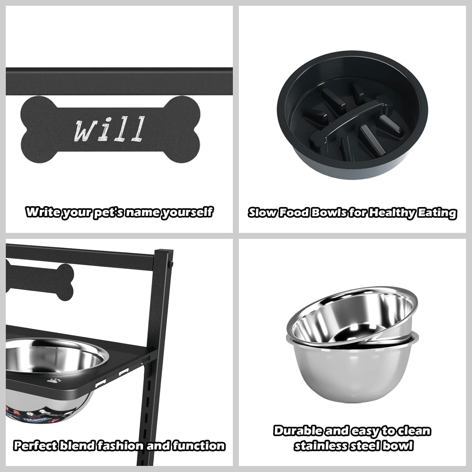 9 Height Adjustable Dog Bowl Stand with Two 1.7L Stainless Steel, Slow Feeder Bowls and Nonslip Pad, Perfect for Medium and Large Dogs