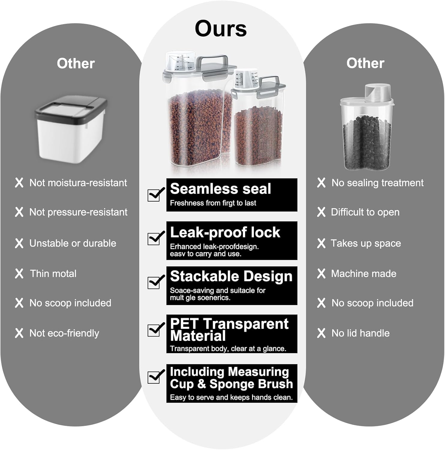 (3+5LBS 2Pack Cat Dog Food Storage Container Upgraded Large Nozzle BPA-free, Plastic Pet Food Containers, With 4 Sealed Clasps/1 Measuring Cup/Handle Easy Clean and Carry (Clear Grey)