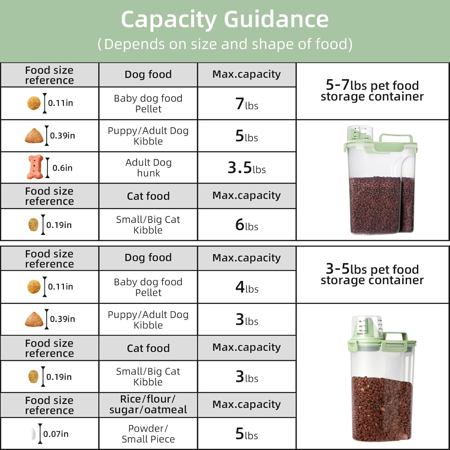 - MULTI-PUrRPOSE STORAGE:Our pet food container is suitable for storing dog food、cat food、bird seed、fish food、rice、 dry food、cereals、oats、cat litter 、flour and other large and small grains, as well as washing powder used at home. It is also a good choice.