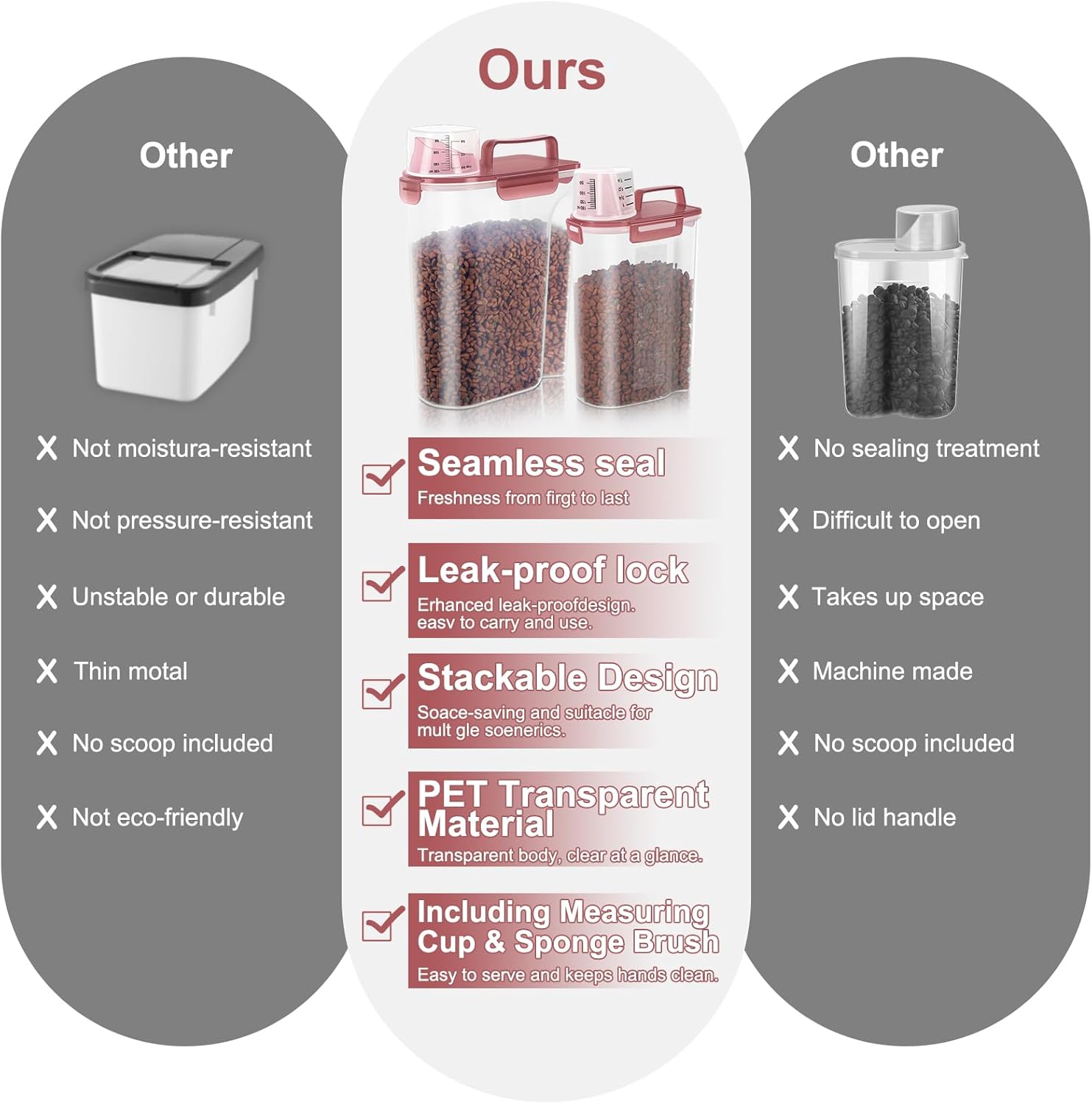 2Pack Cat Dog Food Storage Container with Upgraded Large Nozzle BPA-free, 3+5lbs Plastic Pet Food Containers with 4 Sealed Clasps/1 Measuring Cup/Handle Easy to Clean and Carry (Clear Pink)