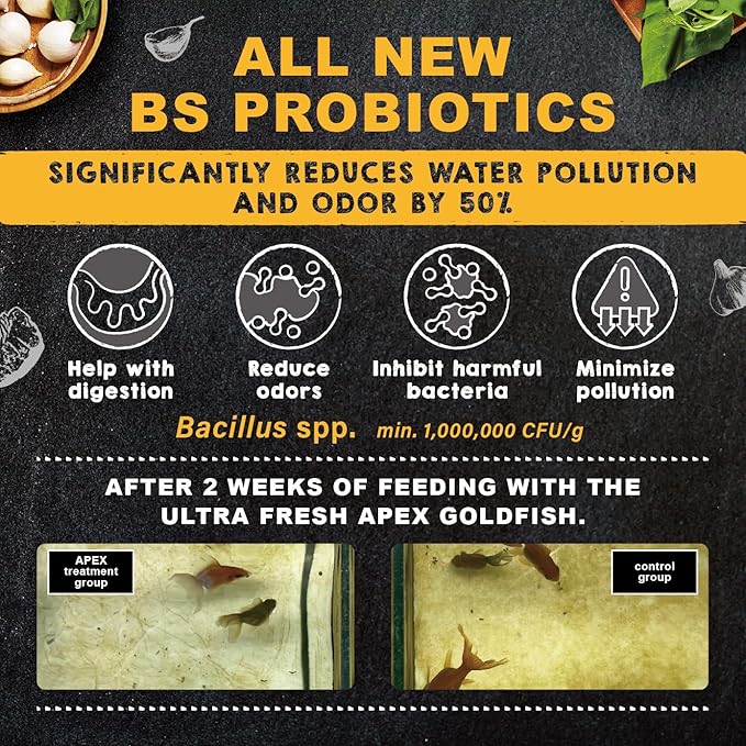 - BS Probiotics: Significantly reduces water pollution and odor by 50%. Specifically designed for fish which can quickly form a healthy intestinal microbiome, enhancing the nutrient absorption. Not only can effectively inhibit harmful and putrefying bacteria but also can decompose ammonia and hydrogen sulfide in excrement, reducing water odor and pollution by up to 50%.