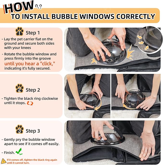 - How to Install Correctly: After receiving the product, please refer to the listing's video and images for proper installation. Please note that the first step requires you to place the pet cage flat on the ground and secure the sides with your knees. Rotate the bubble window and press it firmly into the groove until you hear a click, indicating it is fully secured