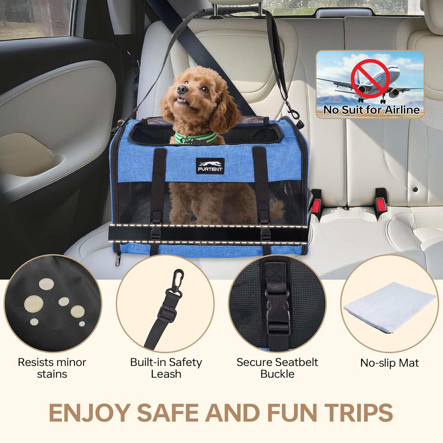 - Multi-Carrying Options for Any Trip. Features a shoulder strap, suitcase strap, and car seatbelt buckle to adapt to different travel needs. Whether you're walking, flying, or driving, Furtent pet travel carrier offers secure, hands-free convenience. It also works as a car seat attachment, keeping your pet stable and protected on the road.