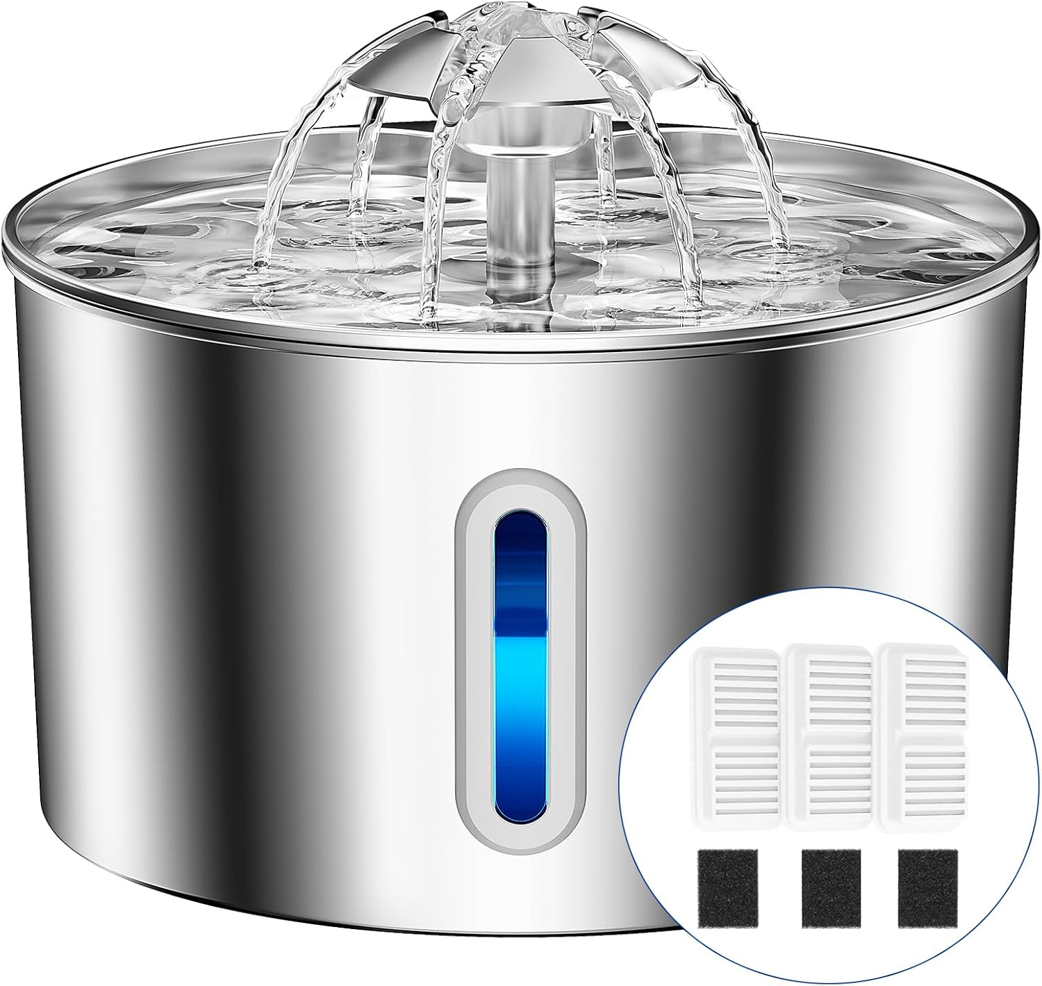 - 3-Stage Filtration System: Stainless steel pet water fountain is equipped with an activated carbon filter, which consists of cotton layer, activated carbon, and ion resin, forming a triple filtration system. From removing impurities, to filtering out tiny particles to adsorbing odors and contaminants, the quality of your pet friend's drinking water is ensured on all fronts with our cat water fountain filter