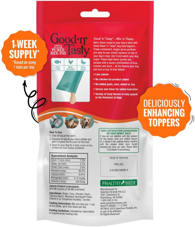 - DOG FOOD TOPPER TREATS: Good ‘n’ Tasty Triple Flavor Puree Mix-Ins enhance kibble’s taste and add flavor and protein to your pet's daily diet.