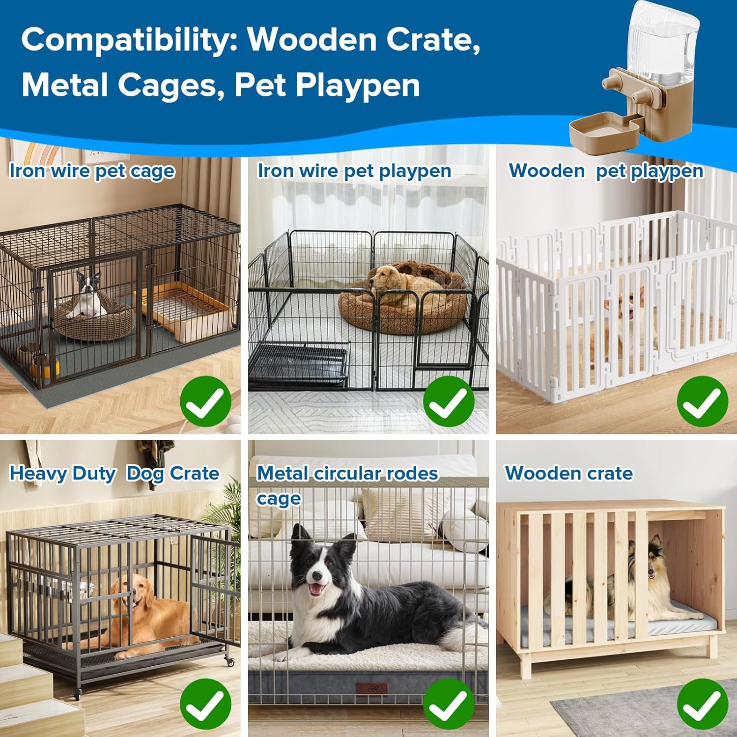 - Cage Compatibility: This pet water dispenser is suitable for Heavy Duty Crate,Iron wire pet cage or Metal circular rodes cage,Iron wire pet playpen and Wooden crate.The Width range: 1.2 inches -5.2 inches, minimum height: 1.3 inches (> 1.3 inches).