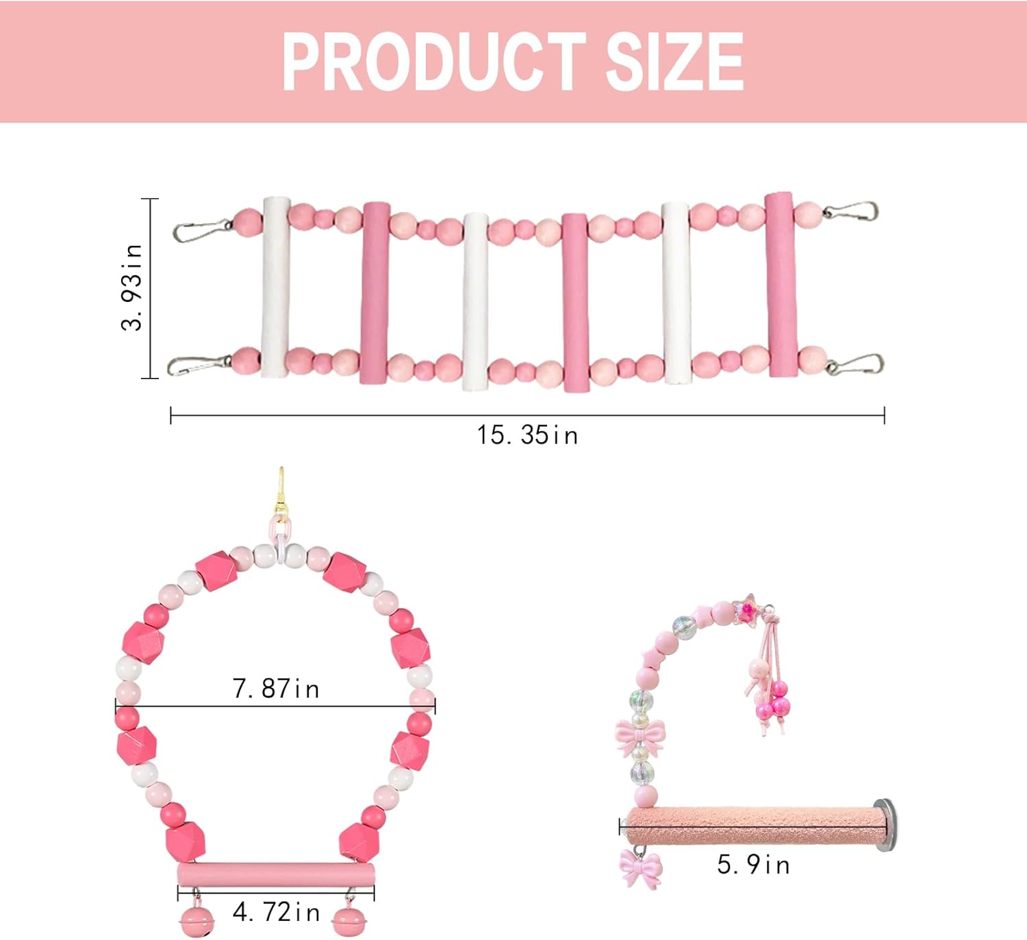 - 【Pink Aesthetic Design Brightens the Cage】The soft and vibrant pink color of the parrot toys set instantly boosts the visual appeal of the birdcage. It breaks the dullness of plain enclosures, adds a lively and cheerful vibe to your parrot’s living space, and makes the cage look more vivid and attractive at a glance.