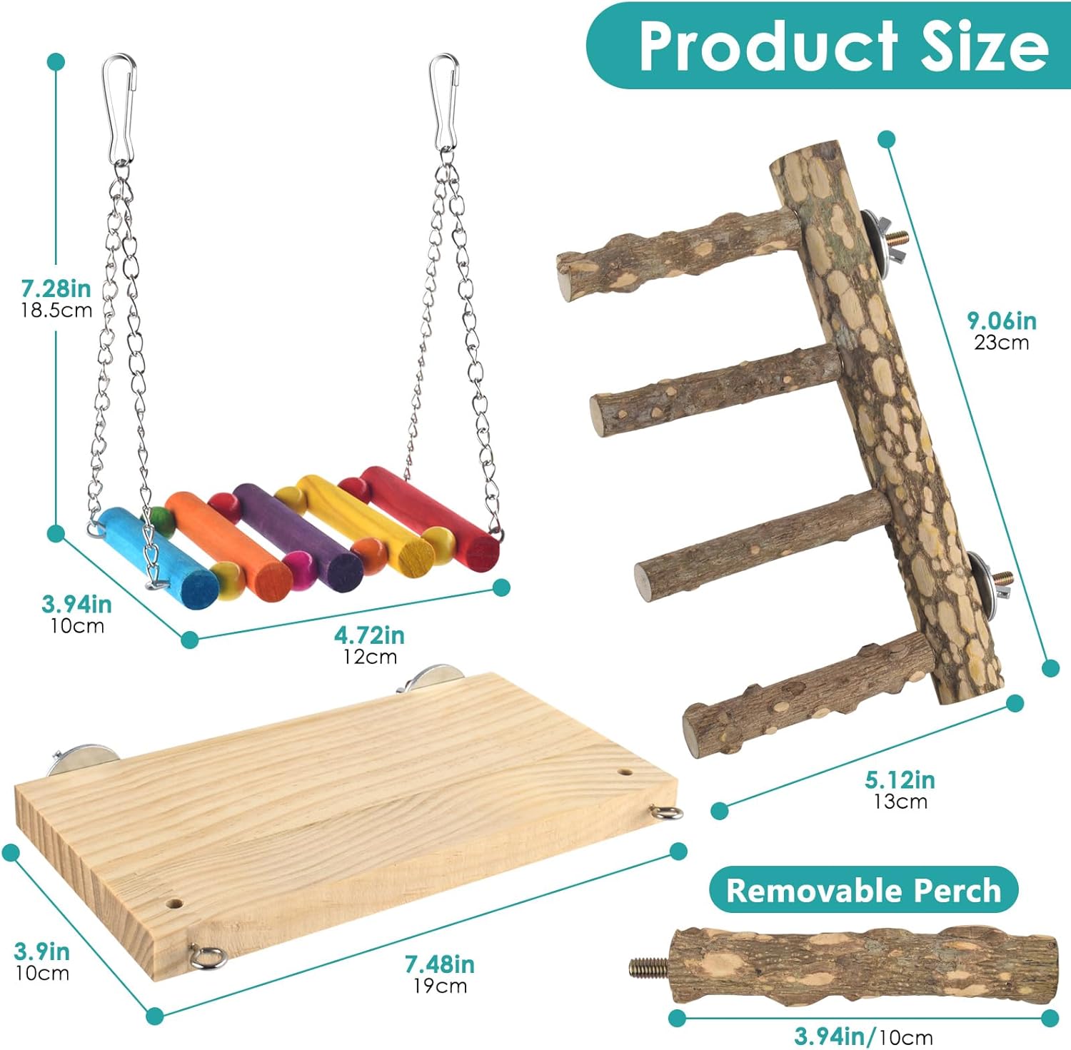 - 3 Pcs Bird Toys Set: DBNESS bird toys for parrots set is crafted from natural wood and dyed with food-grade pigments. It includes 1 parrot perches platform, 1 pepperwood climbing ladder perches for cage, and 1 vibrant wooden hanging bird swing hammock. These three different types of bird cage toys can meet all your parrot's needs for climbing, chewing, playing, and resting