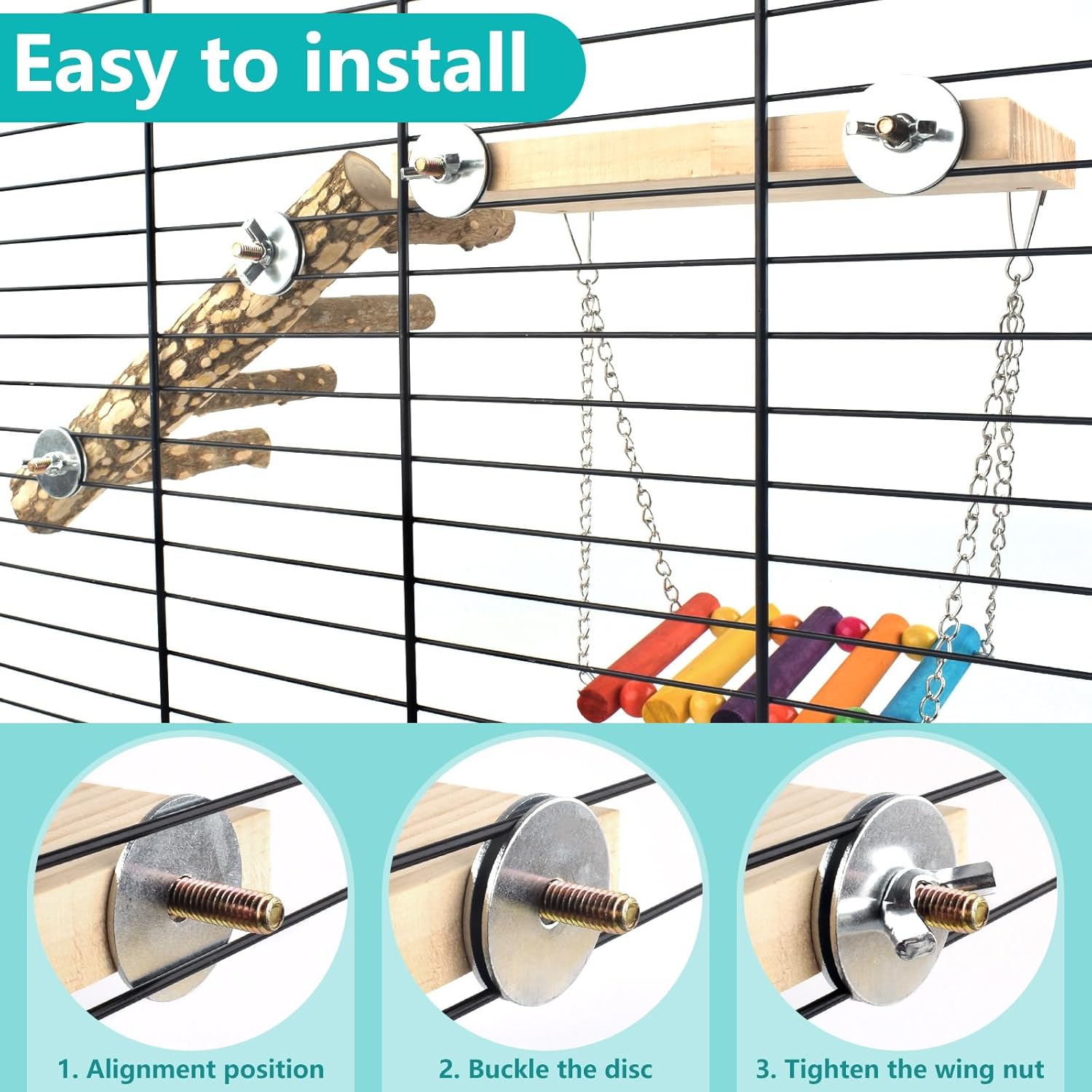 - Easy to Install: Both the parrot perches platform and the bird climbing ladder are equipped with metal washers and nuts, ensuring a secure and stable fit. They can be quickly installed either inside or outside the birdcage. The parrot ladder perches can be installed horizontally or at an angle according to your parrot's preferences (Note: The four short rods of the parrot ladder are removable). The top of the hanging parrot swing hammock is fitted with a metal hook, making it easy to hang from the top of the birdcage. Crafted with high quality, you can use it with peace of mind