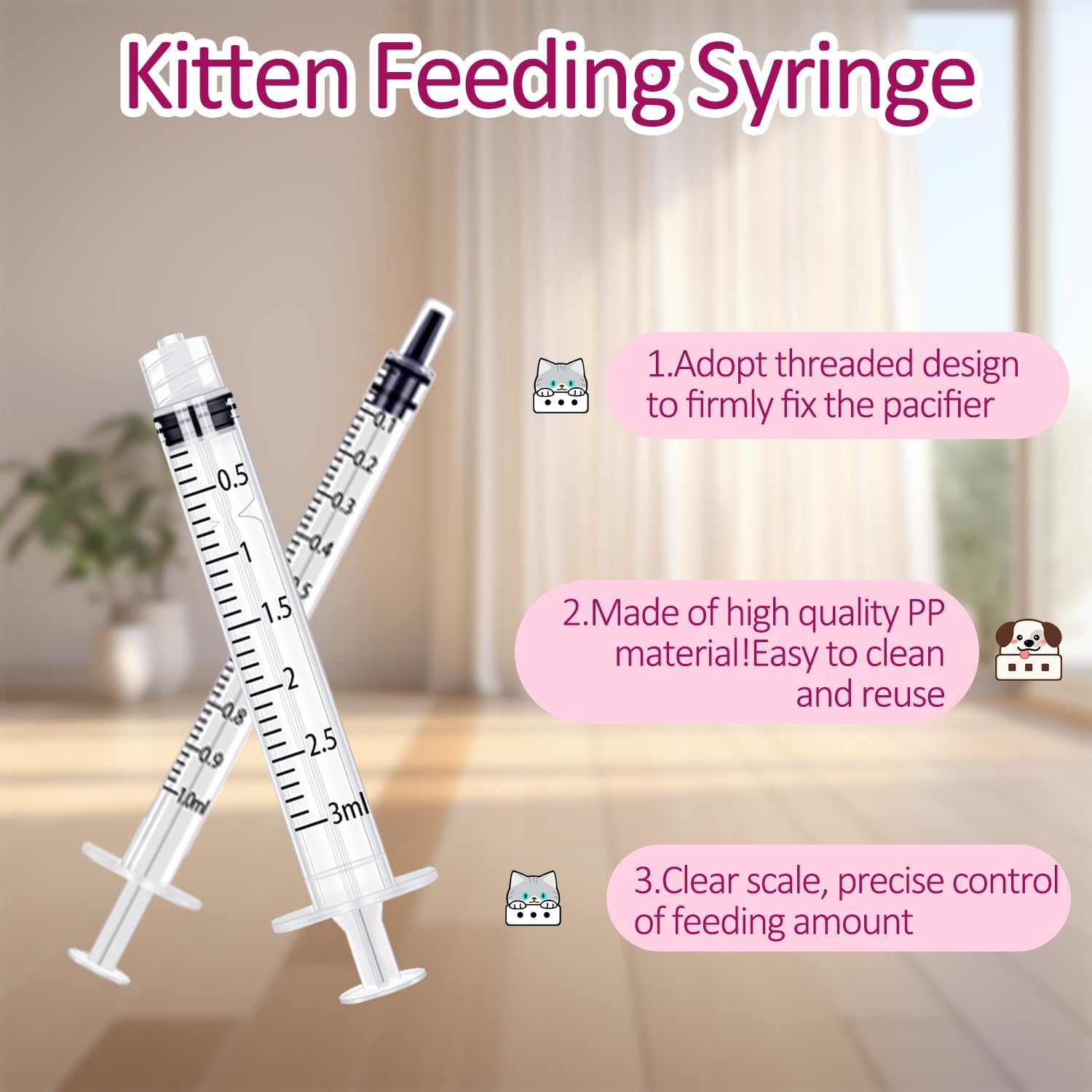 - 【Pet Nursing Bottle Kit Includes】You will get a 90ml puppy bottles for nursing puppy milk,3 different sizes of nipples for puppy bottles,4 pieces of nipples in 2 sizes for syringes feeding,4 pieces of pet nursing syringes in 1 ml, 3 ml, 4 cap and a cleaning brushes,ample quantity can provide various needs and replacements. Flexible feeding kit for newborn kittens and puppies.