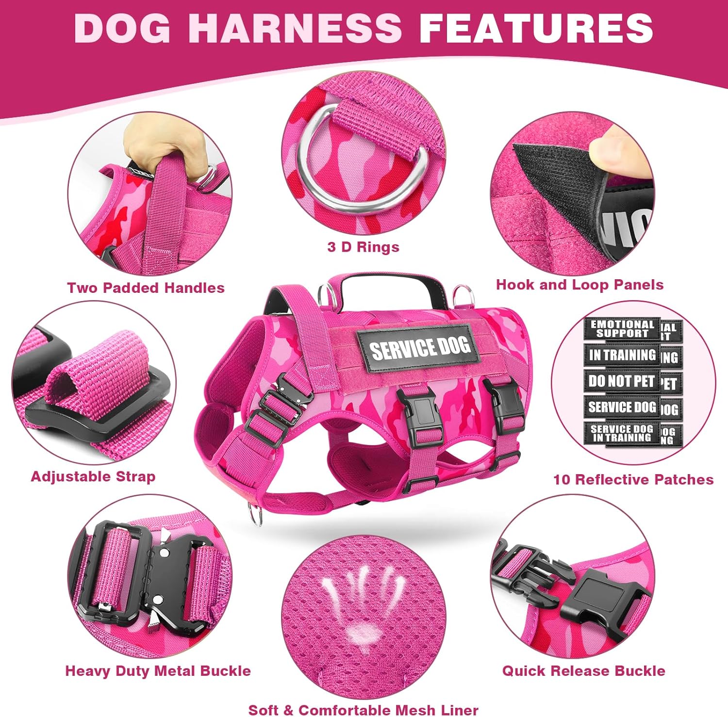 - 【Molle System】: Equipped on both sides for pouches, water bottles, and tactical dog gear. Multiple Hook & Loop Panels for morale patches and badges to showcase your dog’s personality. A wide range of use for personal service, law enforcement, or outdoor recreation. The package contains a dog harness, and 10 pieces of dog patches, such as Service dog, do not pet, in training, emotional support and service dog in training, enough quantity for you to decorate the dog’s vest harness.