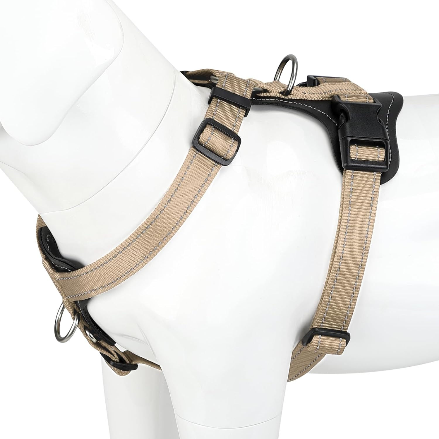 Plutus Pet Adjustable No Pull Dog Harness with Leather Accents, Heavy Duty Reflective Nylon Vest for Training, Hiking, Easy Walk Harness for Small, Medium, Large Dogs (Beige, S)
