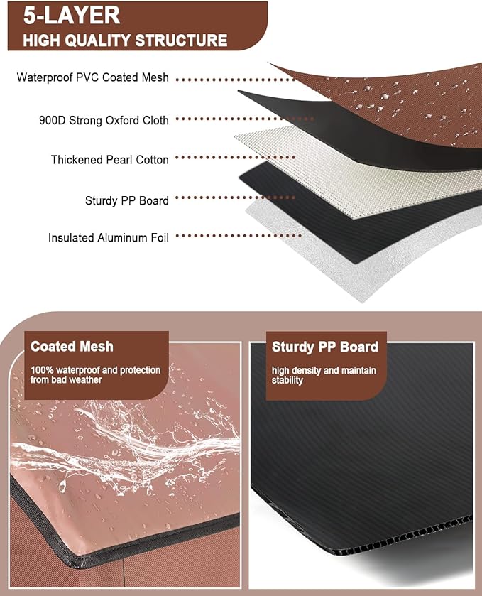 - Excellent Weatherproof and Waterproof: The roof of outdoor cat house for winter is designed with five layers of material, including a layer of waterproof mesh material, which effectively improves the waterproof performance. At the same time, an aluminium foil layer is added inside to further prevent moisture and heat preservation, ensuring that your beloved cat is always dry, comfortable and warm.