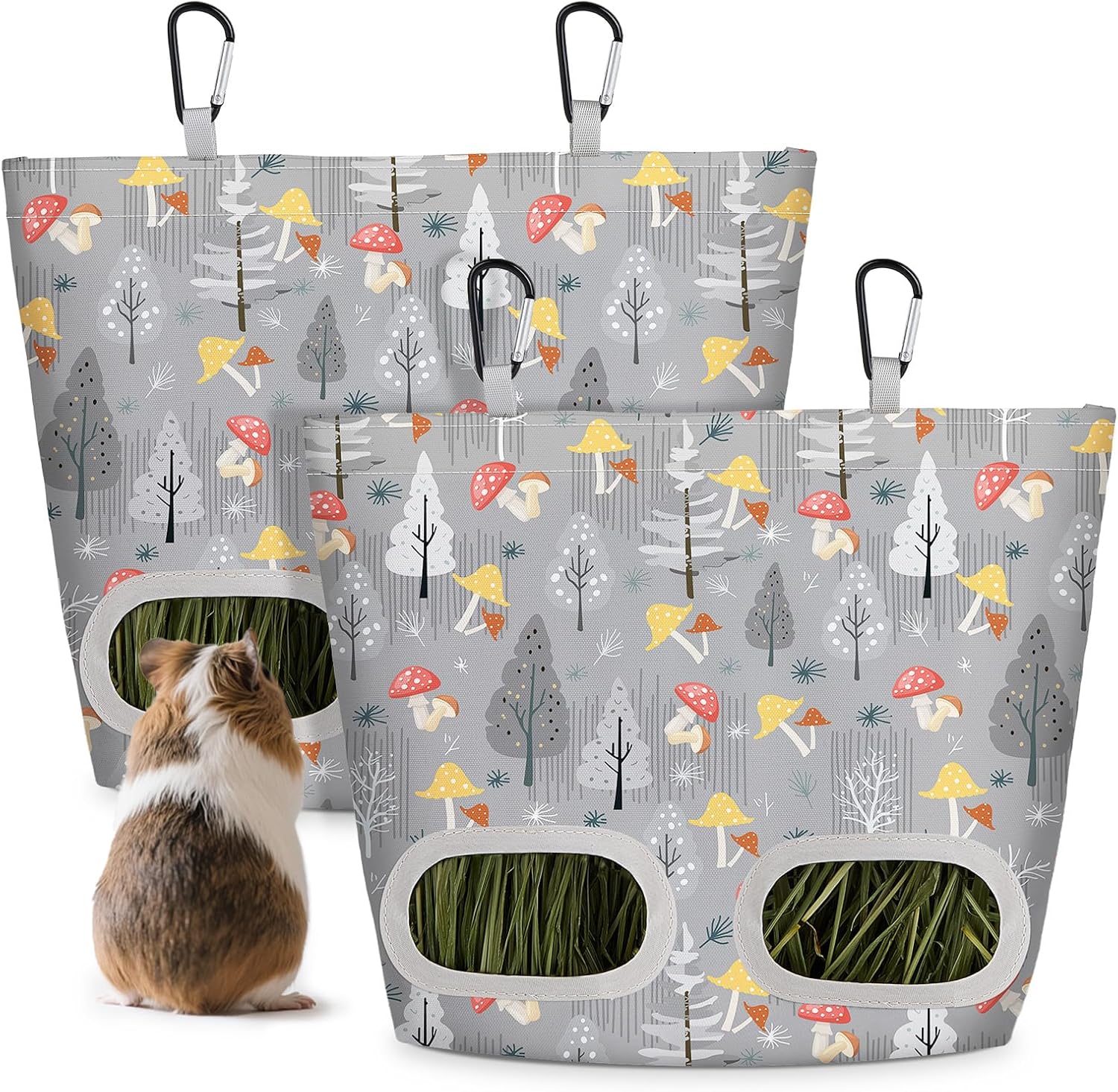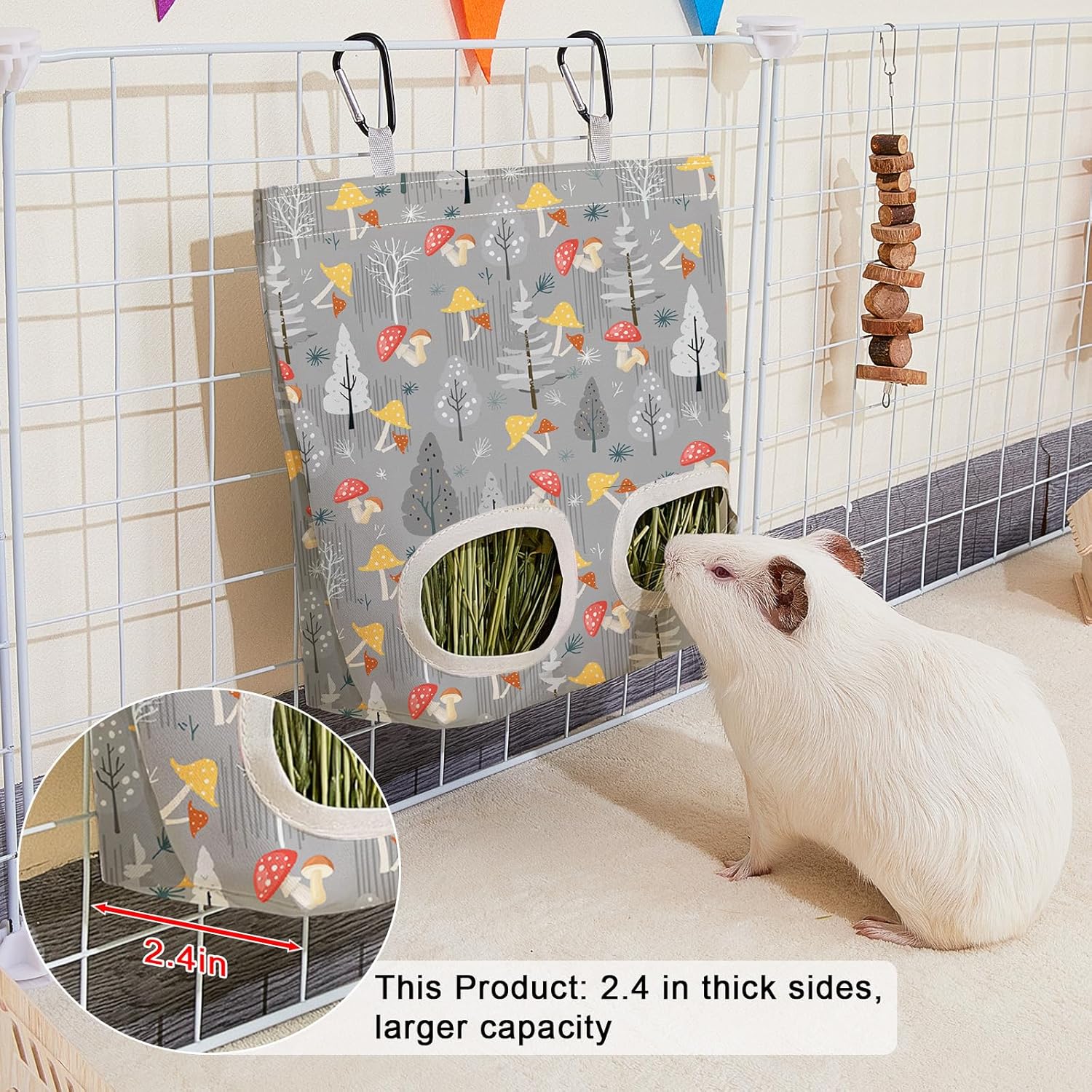 Glittme 2 Pack Guinea Pig Hay Feeder, 11.5x9 Inch Hay Bag for Rabbits, Hanging Hay Holder for Guinea Pigs Cage Hay Feeder for Bunny, Small Pets,Grey Mushroom