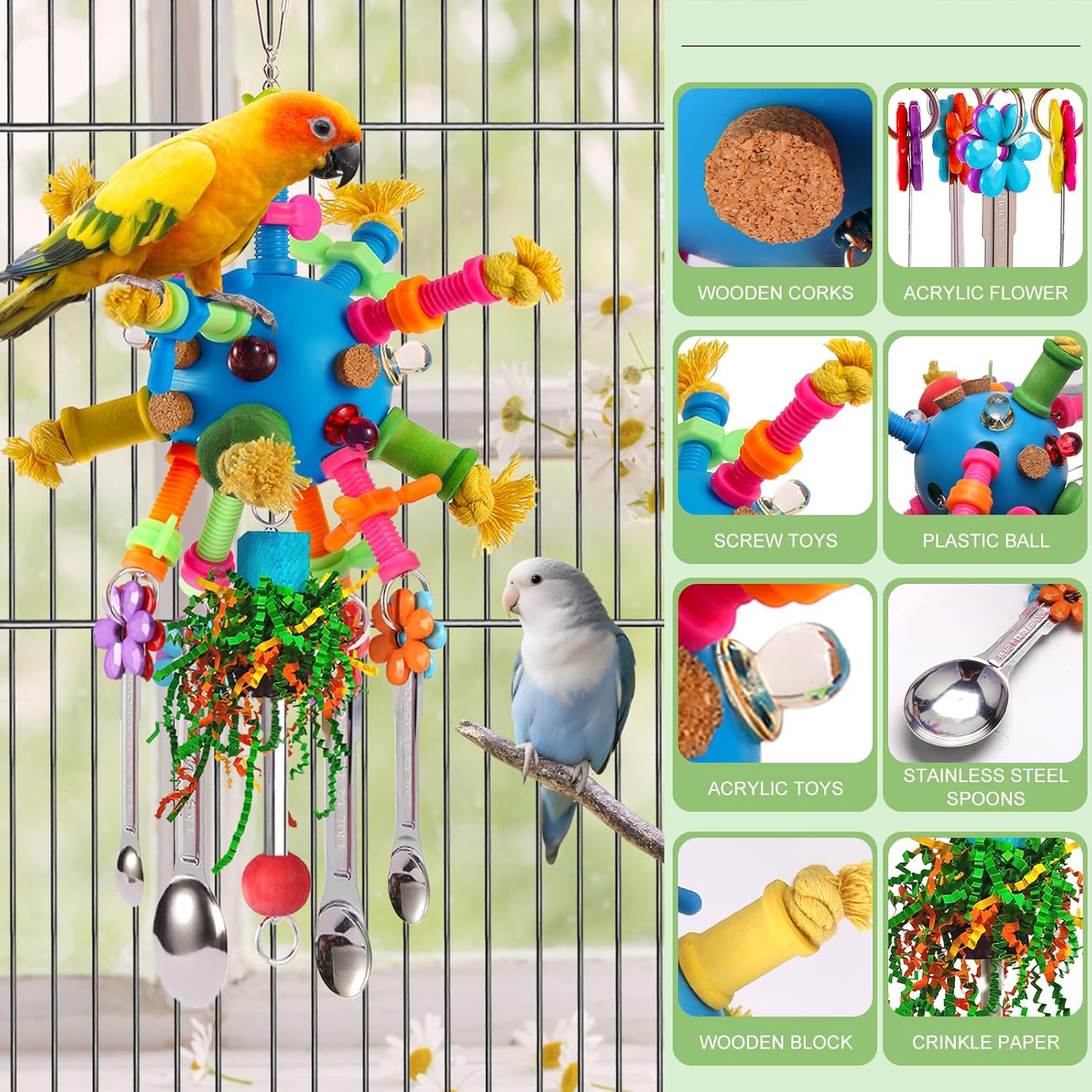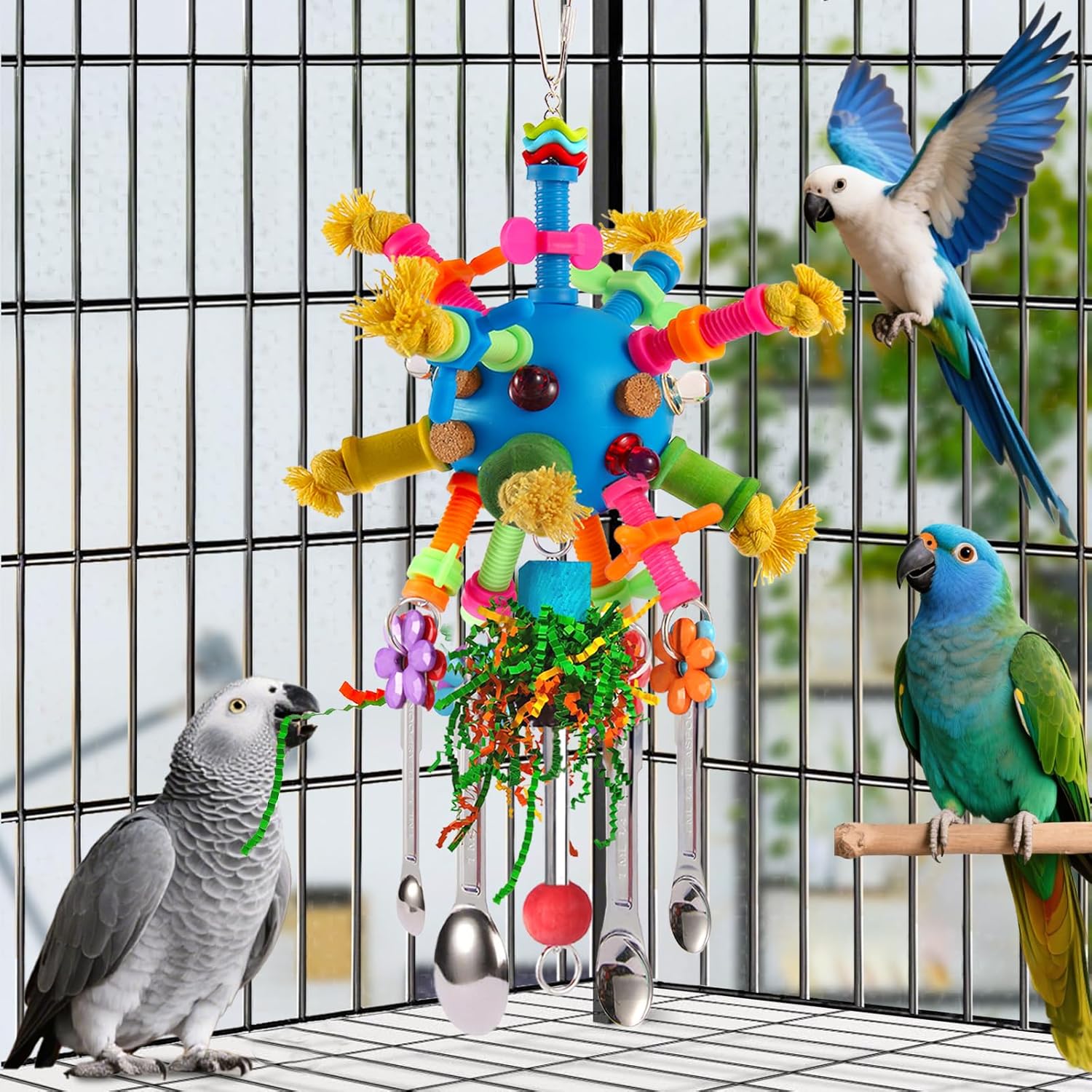 - ๐ Bird toys that captivate: YIXUND Parrot toys features four gleaming stainless steel spoons for bird that reflect light like tiny mirrors, paired with rustling crinkly paper, tinkling wind chimes,vibrant acrylic bird toys, and a blue holey ball for birds.This dazzling rainbow of colors and intriguing textures creates an irresistible visual spectacle inside the cage, instantly grabbing your feathered bird friend's attention.