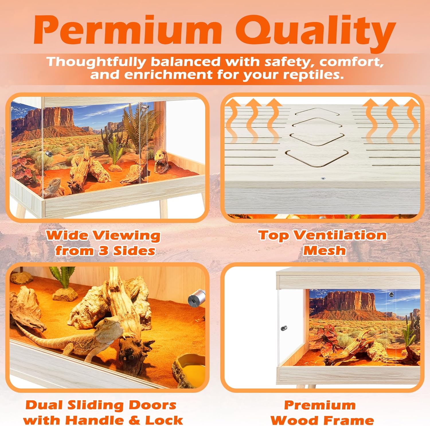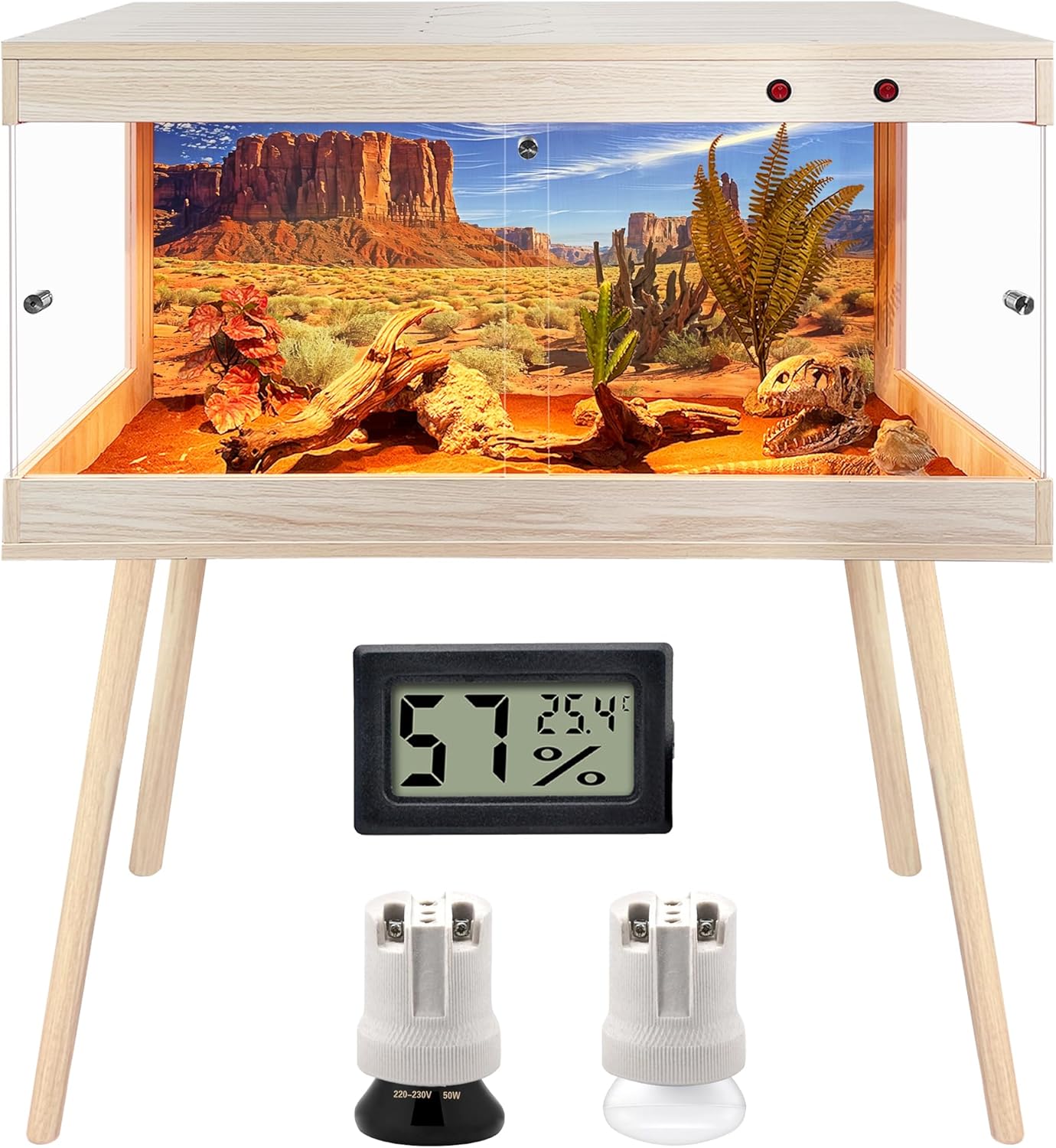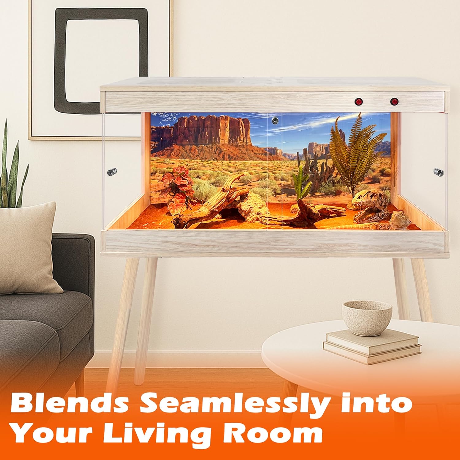 - 【Premium Craftsmanship & Materials】Built with natural wood and strong tempered glass, this reptile terrarium combines strength with a sleek, modern look. The interior is coated with a water-resistant finish for long-lasting use, while the acrylic bottom panel ensures dependable moisture protection against spills and substrate buildup. Its roomy design provides ample space for your reptile to climb, bask, and hide—encouraging natural activity and supporting overall well-being. Available in 4 sizes, each enclosure comes with 4 sturdy legs (see image 2 for detailed dimensions).