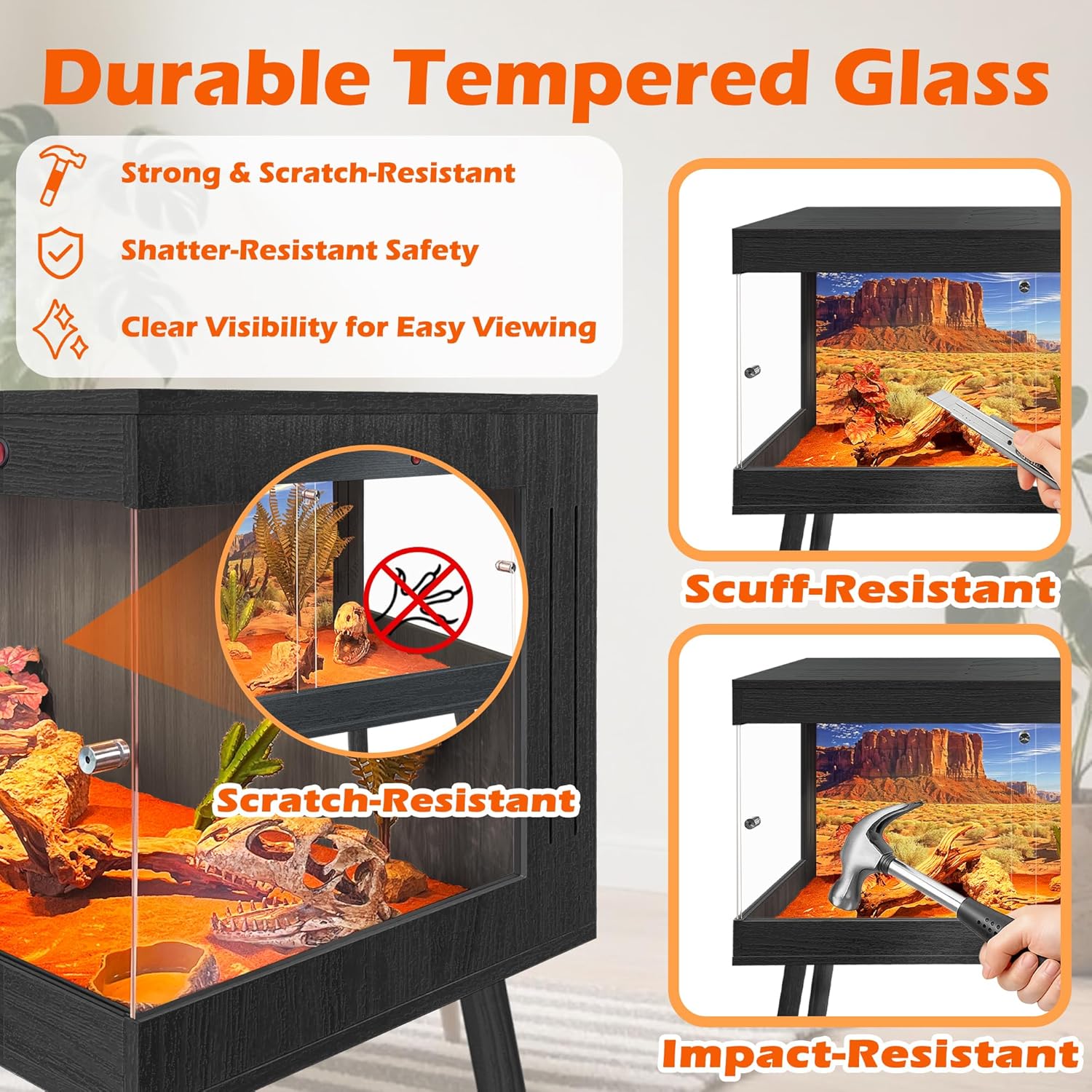 - 【Clear Tempered Glass Panels】Three sides feature tempered glass, delivering crystal-clear views from multiple angles. Unlike ordinary glass or acrylic, tempered glass is tougher and more scratch-resistant—perfect for reptiles that like to climb or scratch. The sliding glass front doors include an ergonomic handle and a secure locking system, giving you convenient access while keeping your pet safe inside.