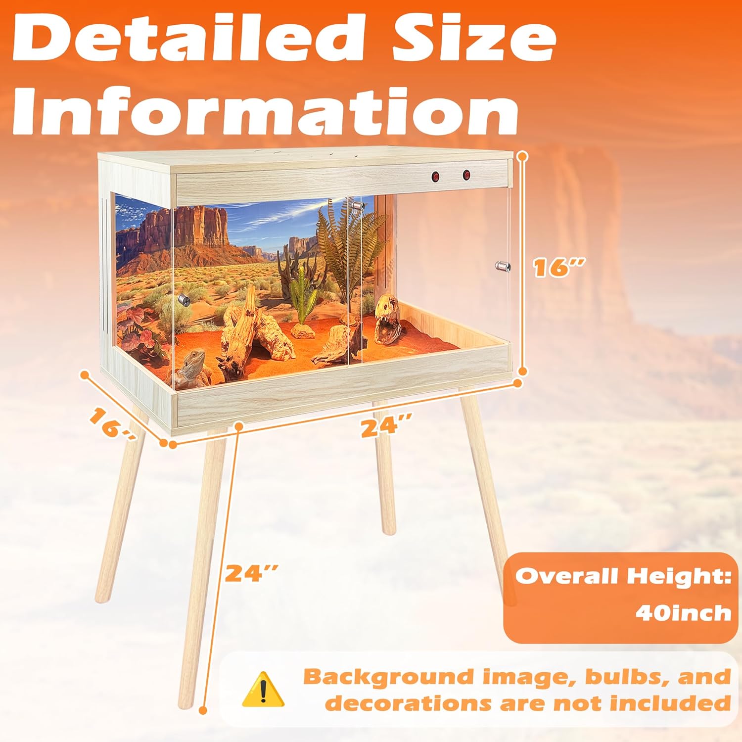- 【Premium Craftsmanship & Materials】Built with natural wood and strong tempered glass, this reptile terrarium combines strength with a sleek, modern look. The interior is coated with a water-resistant finish for long-lasting use, while the acrylic bottom panel ensures dependable moisture protection against spills and substrate buildup. Its roomy design provides ample space for your reptile to climb, bask, and hide—encouraging natural activity and supporting overall well-being. Available in 4 sizes, each enclosure comes with 4 sturdy legs (see image 2 for detailed dimensions).