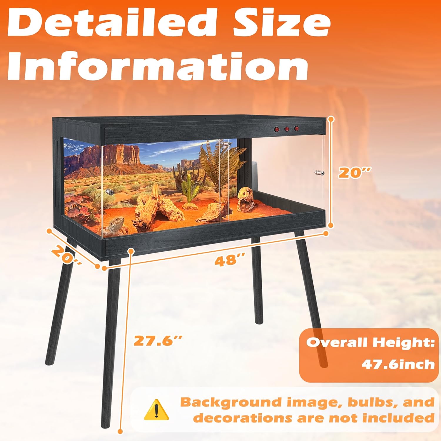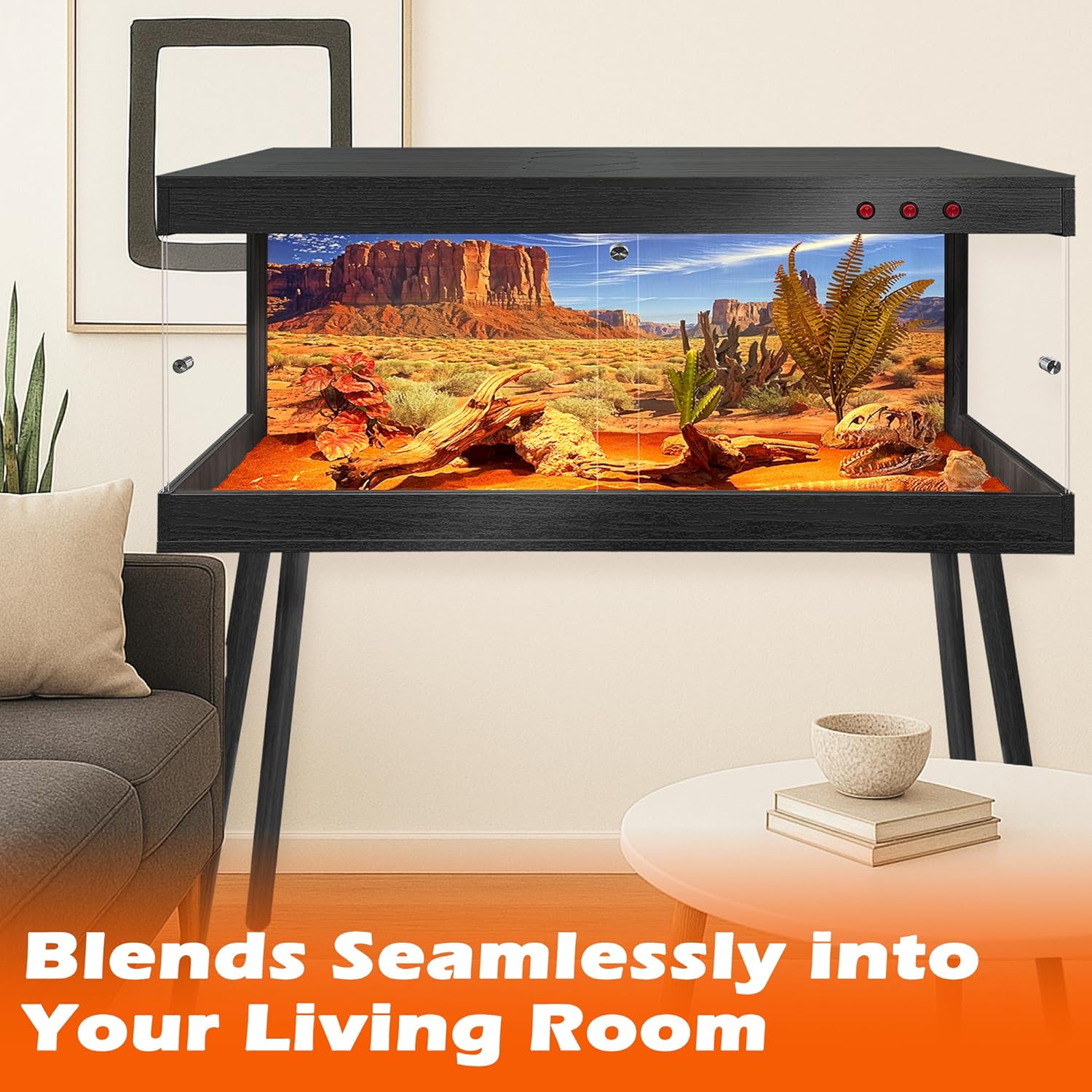 - 【Premium Craftsmanship & Materials】Built with natural wood and strong tempered glass, this reptile terrarium combines strength with a sleek, modern look. The interior is coated with a water-resistant finish for long-lasting use, while the acrylic bottom panel ensures dependable moisture protection against spills and substrate buildup. Its roomy design provides ample space for your reptile to climb, bask, and hide—encouraging natural activity and supporting overall well-being. Available in 4 sizes, each enclosure comes with 4 sturdy legs (see image 2 for detailed dimensions).