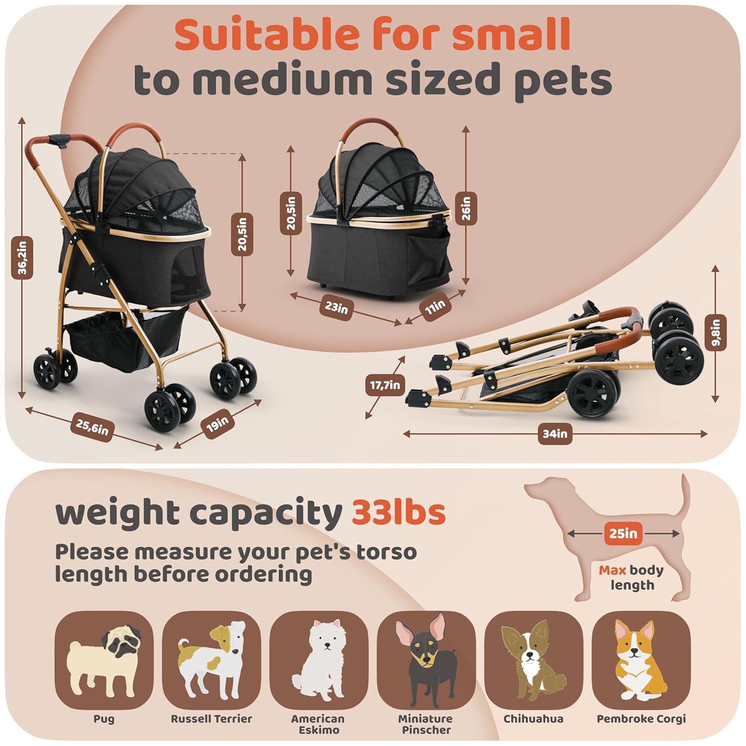 - πΎ Designed for Small to Medium Pets β up to 33lbs. Spacious and comfortable stroller for pets with a torso length up to 25 inches β ideal for Pugs, Corgis, Chihuahuas, and other small to medium-sized dogs and cats.