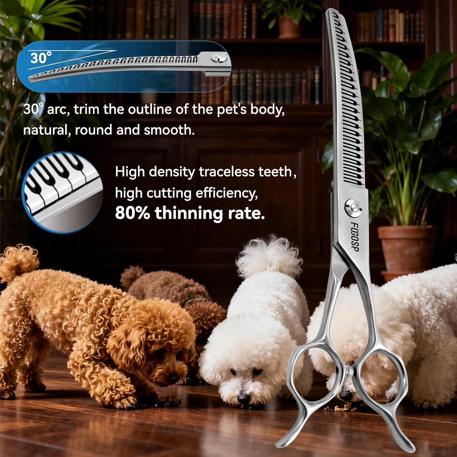 - Gradient wide tooth design for smoother and more effortless dog hair cutting: FOGOSP dog grooming scissors adopt a unique gradient wide tooth design to evenly distribute cutting force. Whether you're trimming fine, soft fur or thick hair, the curved chunkers dog scissors cut with dramatically reduced resistance and a gentle, effortless feel. Significantly reduce the operational fatigue of pet groomers and make care more humane.