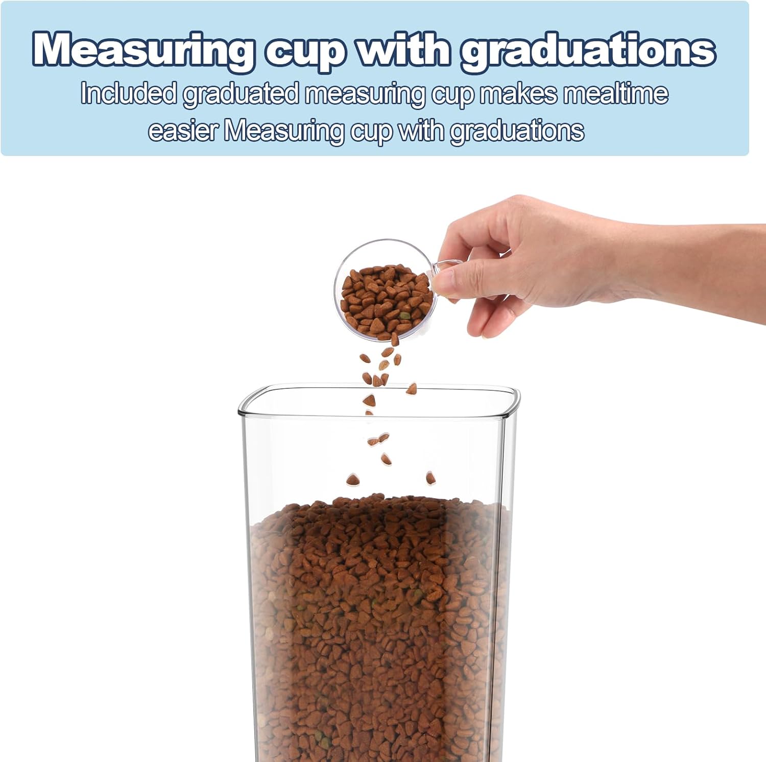 - Dog food Storage Container Set:Product size: 5.98" W x 8.15" D x 11.73" H IN. It consists of a pet food box, a measuring cup and a sponge cleaning brush. The transparent barrel allows you to see the food at a glance. The measuring cup can measure the amount you need. With the sponge brush, you no longer need to clean it by hand, which is convenient and clean.
