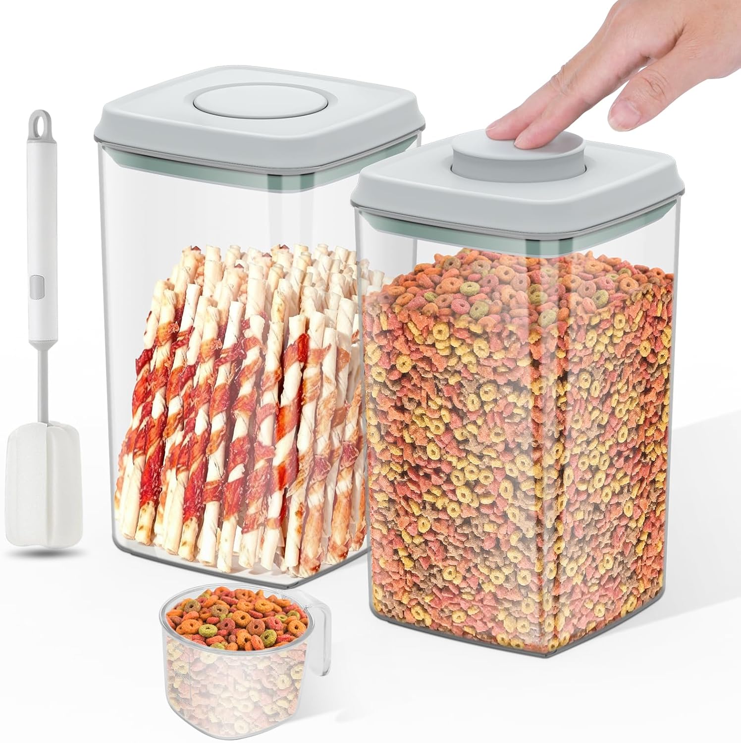 4.2Qt 2Pack Airtight Dog Cat Food Storage Container and Dog Treat Containers BPA-Free, PET Clear Stackable Pet Storage Bin, 1 Cup Scoop, 1 Sponge cleaning brush, Pop Top, With handle (Grey)