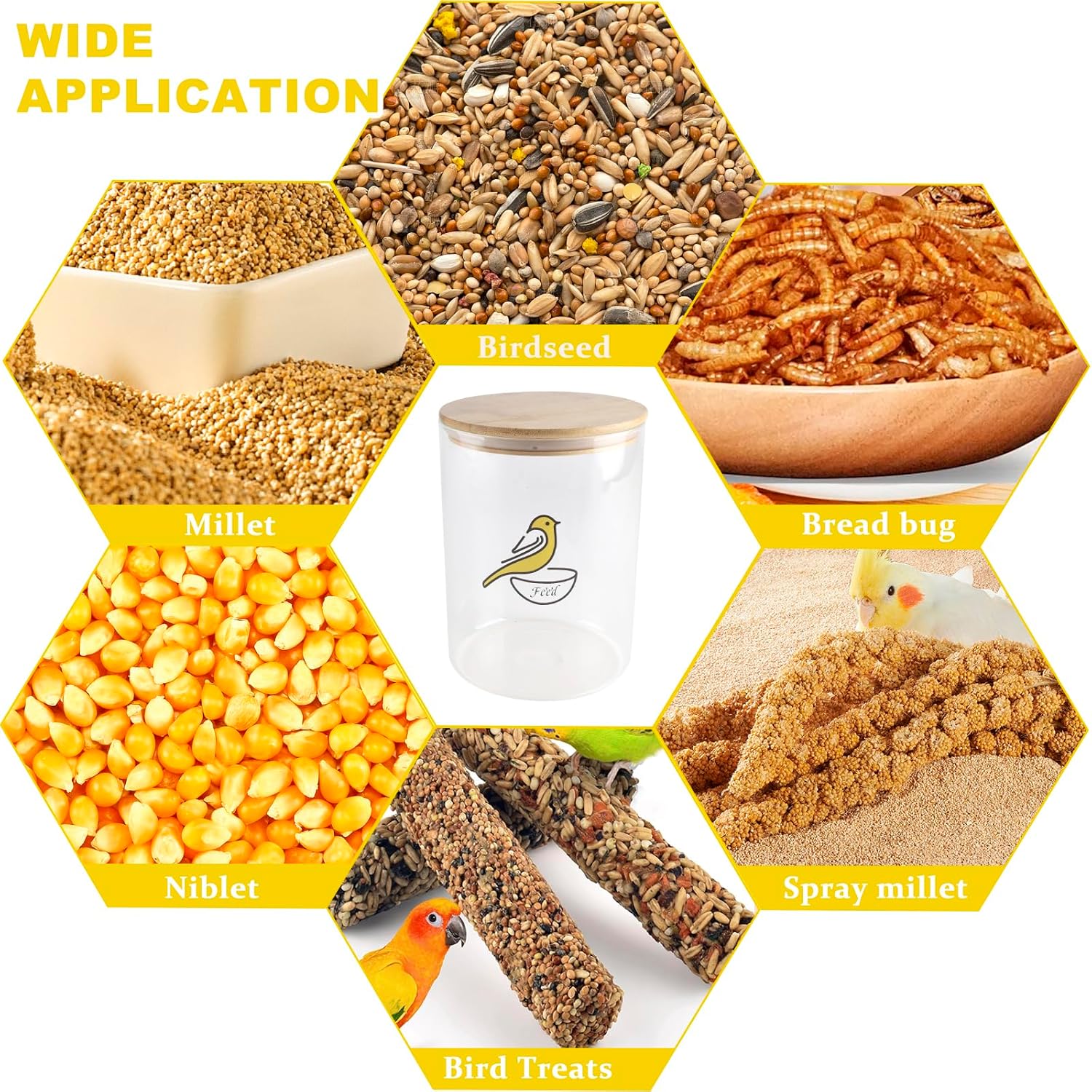 - 3.Multi function pet food storage: :The bird food dispenser high-quality glass materials.Keep all seed fresh and ready to use,ideal for storing wild birdseed ,sunflower seed,fruit and nut seed,Thistle Seeds .