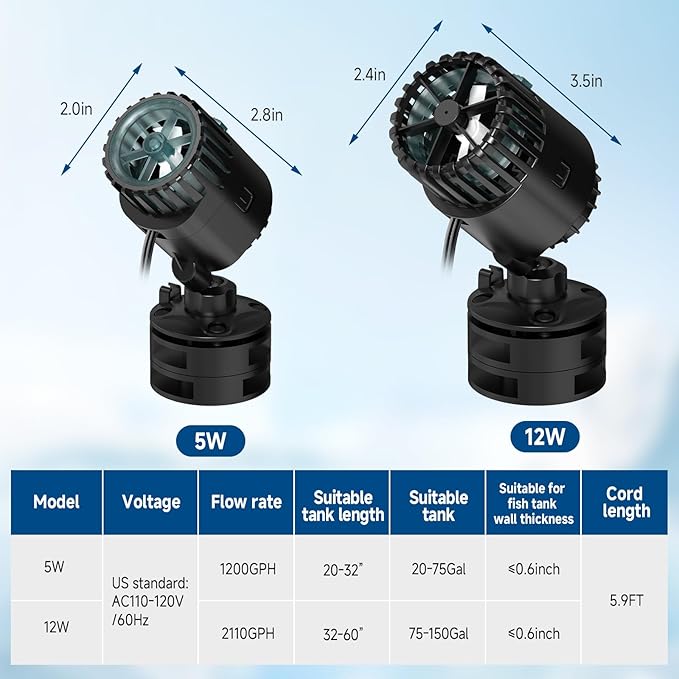 - Powerful Wave Maker, Quiet Operation – High-efficiency water circulation pump delivers strong, reliable flow quietly and energy-efficiently, providing excellent water circulation with minimal impact on fish and plants. Available in 5W (1200 GPH) and 12W (2110 GPH) models, ideal for 20–150 gallon aquariums