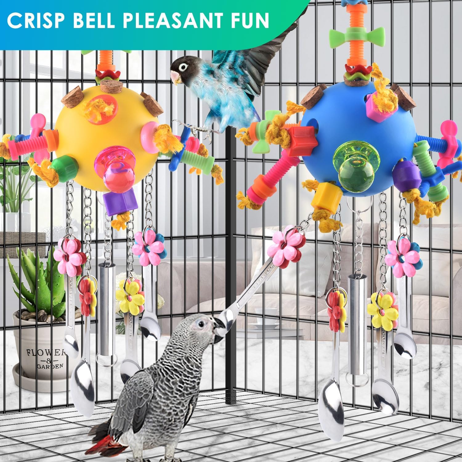 - INTERACTIVE TOY DESIGN: With sturdy spoons and bright wind chime that produce delightful sounds, and hollow design colored ball, surrounded with colored toys, captivating your pet bird's attention. And you can put some treats inside the ball for your bird to forage, add more fun