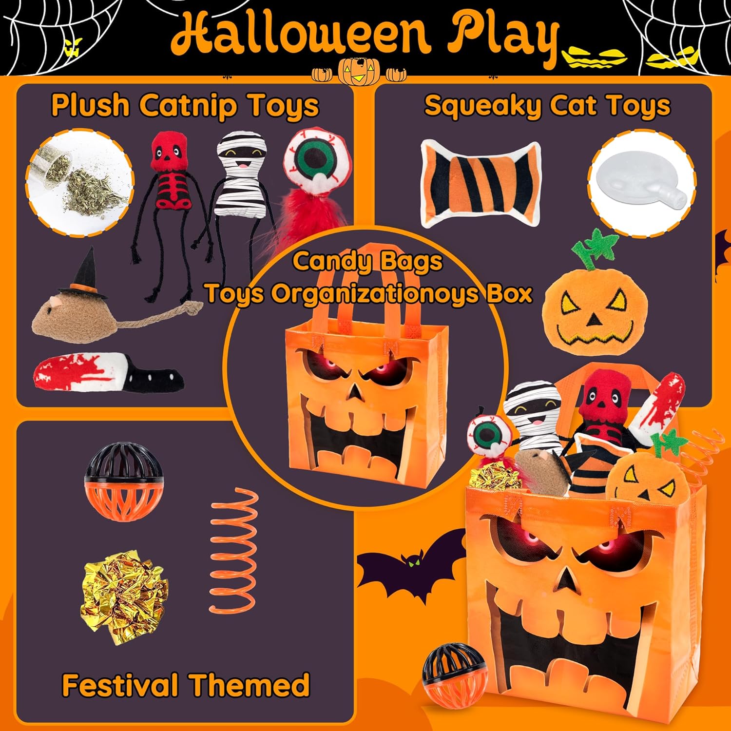 - 【Product List】7 Catnip Plush Toys: Smiling Mummy, Red Skeleton Soldier, Pumpkin Head, Mini Knife, Wizard Mouse, Red Eyeball, Candy. 3 Interactive Toys: 1 Spring Toy, 1 Plastic Ball, 1 Crinkle Paper Ball. 1 Halloween Costume: Bat Wings Outfit for Cats. 1 Storage Bag: Spooky Pumpkin Handbag