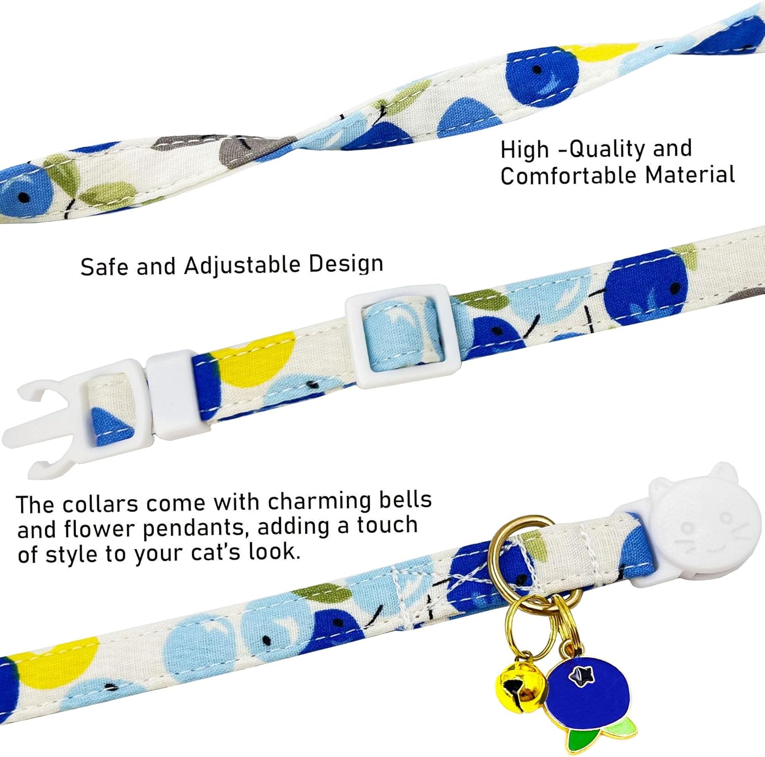 2 Pack Cotton Breakaway Cat Collars Set with Bell and Flower Pendant, Cute Floral Fruit Patterned, Adjustable 7.5-11Inch, Include A Mouse Toy Gift (Watermelon Blueberry)