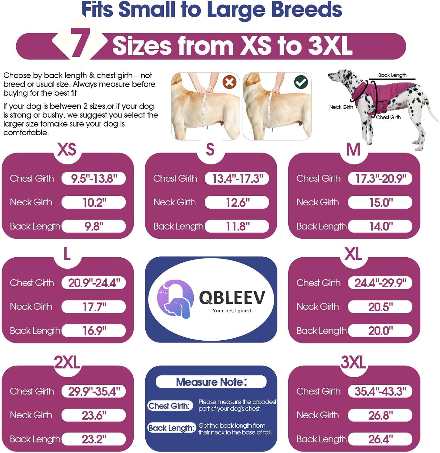- Dog Coats for Small Medium Large Dogs: QBLEEV warm dog puffer vest availables in XS–3XL to suit dogs from tiny Chihuahuas to giant Saint Bernards. Even within the same breed, body shapes vary by age, weight, and gender. Always measure first for a perfect fit