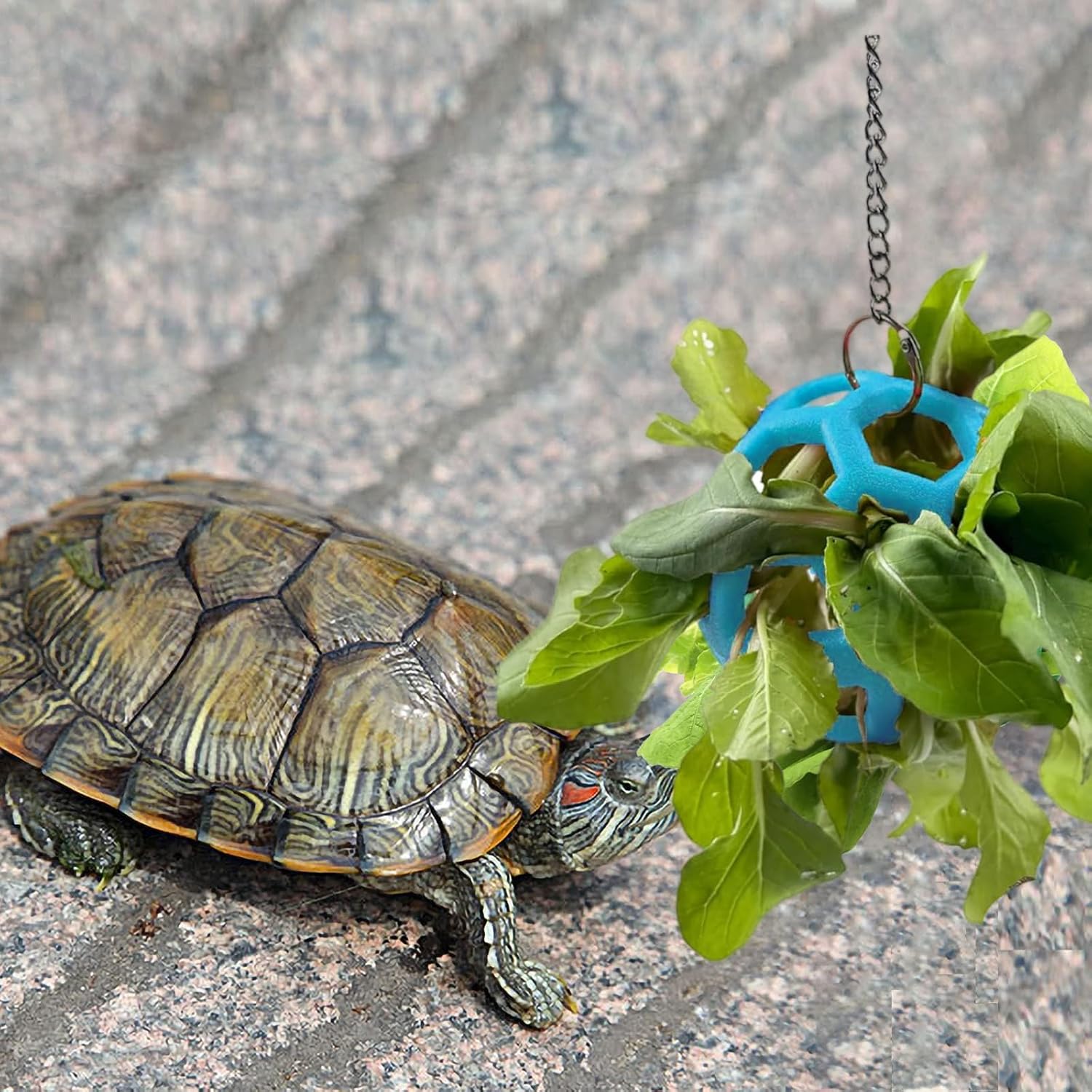 - Adjustable Hanging System: Equipped with a metal chain and hook, the height of the ball can be easily adjusted to suit the cage or habitat of your turtle, maximizing accessibility.