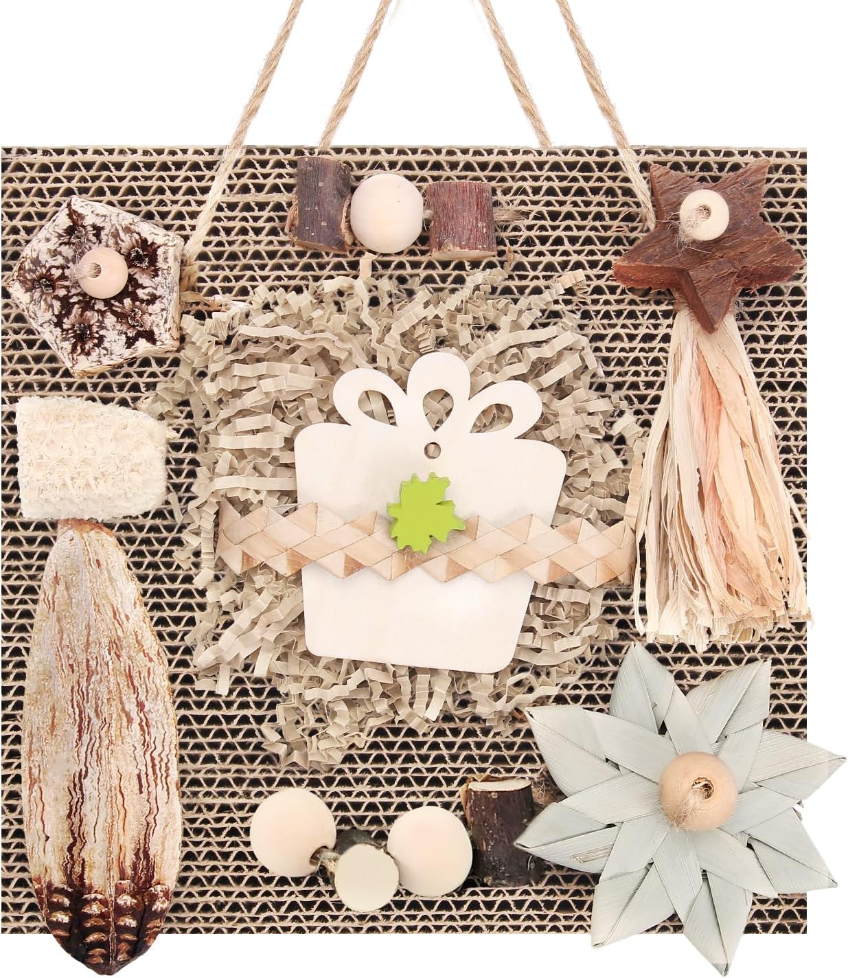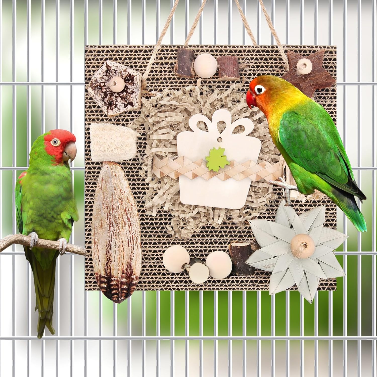 - ๐ฟ Natural & Safe Materials Carefully selected natural materials beloved by parrots - featuring an eco-friendly cardboard base combined with chewable dried starfruit, palm fiber stars, apple wood blocks, corn cob strands, soft silky grass bundles, and natural wooden beads. Completely safe and healthy, allowing your feathered bird friends to fully enjoy exploring and chewing!