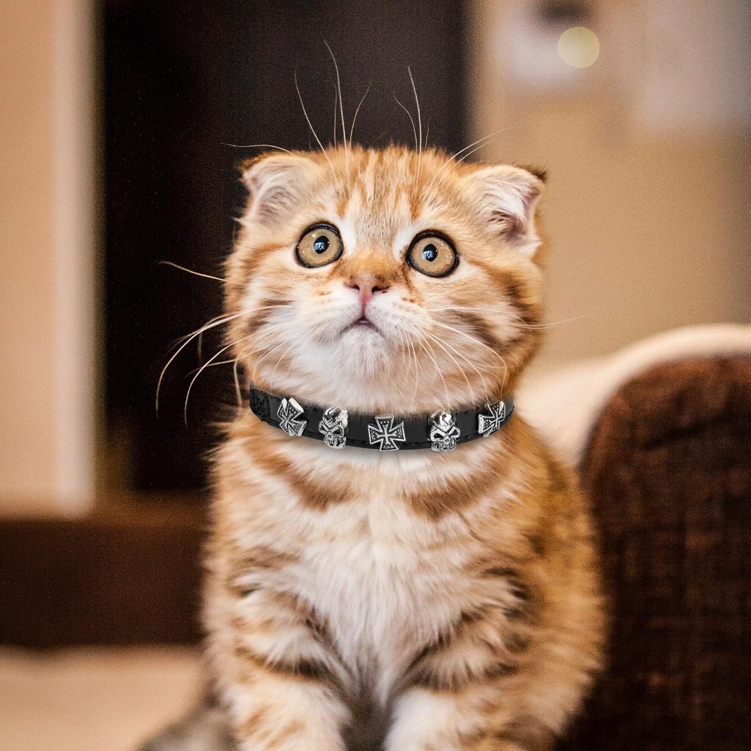 - PERSONALIZED CAT COLLAR: The pet collar features a rivets and skull design, perfect for adding atmosphere to your pet. It also includes bells and small charms to add charm to your pet. The spikes are polished and won't be too sharp, so you don't have to worry about hurting your pet's skin or fur.