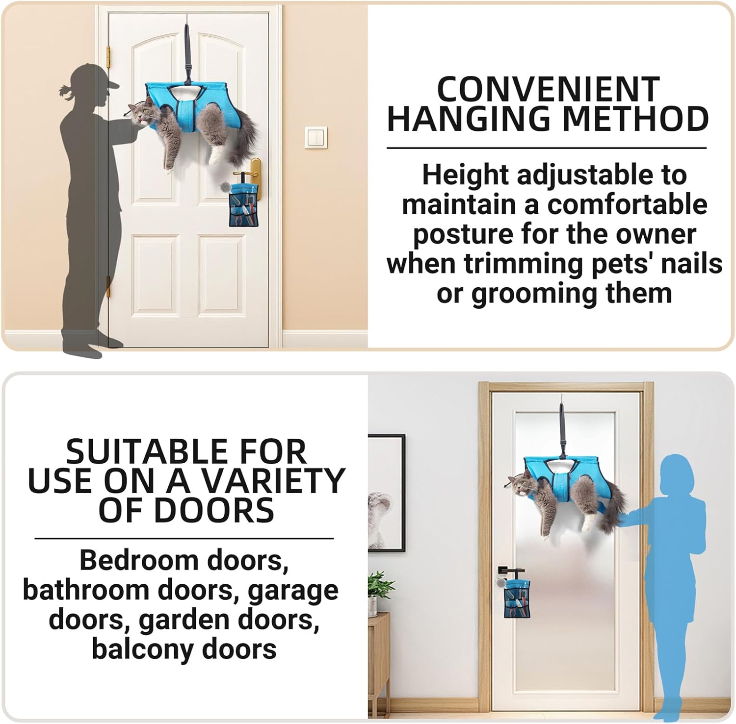 - 1. Innovative Door-Hook Hanging System – No Drilling Required Easily hangs over most standard doors without any installation hassle. Quick setup and removal make grooming your pet stress-free and convenient.