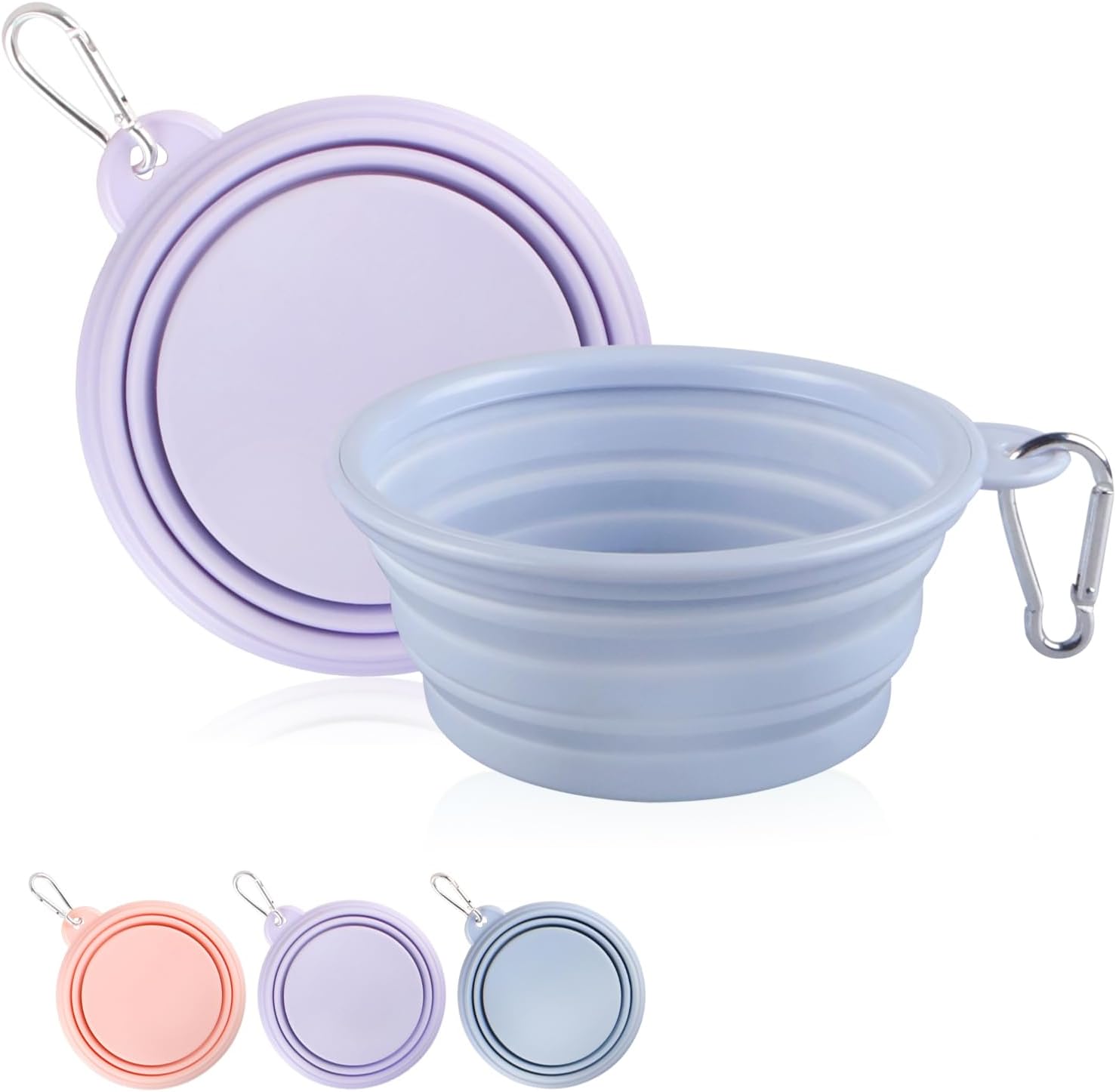 Collapsible Dog Bowls 2-Pack, Portable Travel Dog Bowl with Carabiner, Food-Grade Silicone Pet Bowl for Hiking, Walking (22 OZ Macaron Blue and Violet)