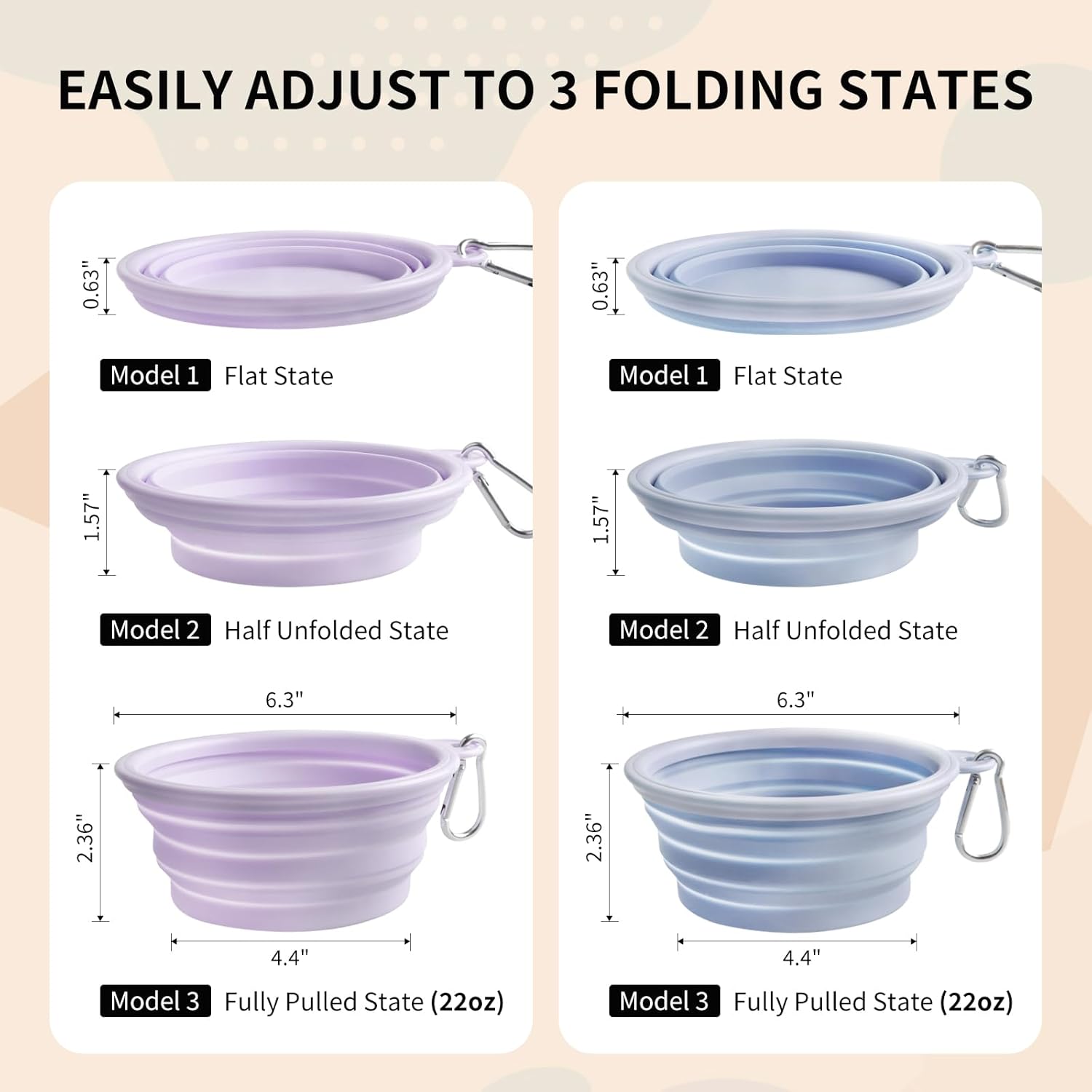 - Portable Collapsible Design - Space-saving foldable bowl features a built-in carabiner clip for hands-free carrying during hikes or Daily walk. The flexible silicone structure pops open instantly for meals and folds into compact storage. Lightweight yet durable for backpack pockets or pet travel kits.