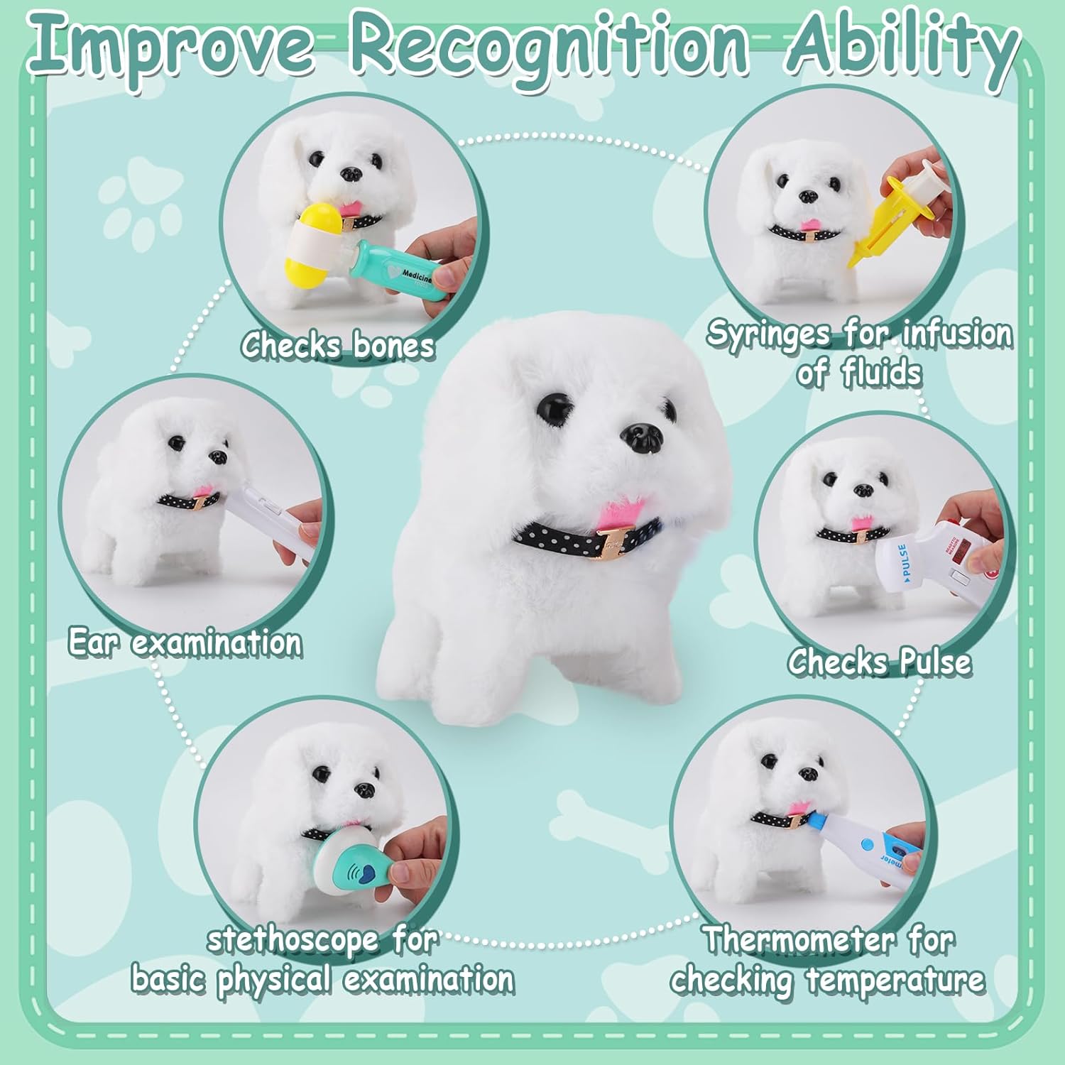 - Treating Your Puppy Friend: In this pet care playset, there are a variety of simulated medical tools for kids to play with, including a plush dog toy, a carrying bag, glasses, a stethoscope, a syringe, tweezers, a thermometer, an otoscope, doctor coat, and so on. Let your little ones experience a range of pet-caring activities with this kids' veterinary playset!