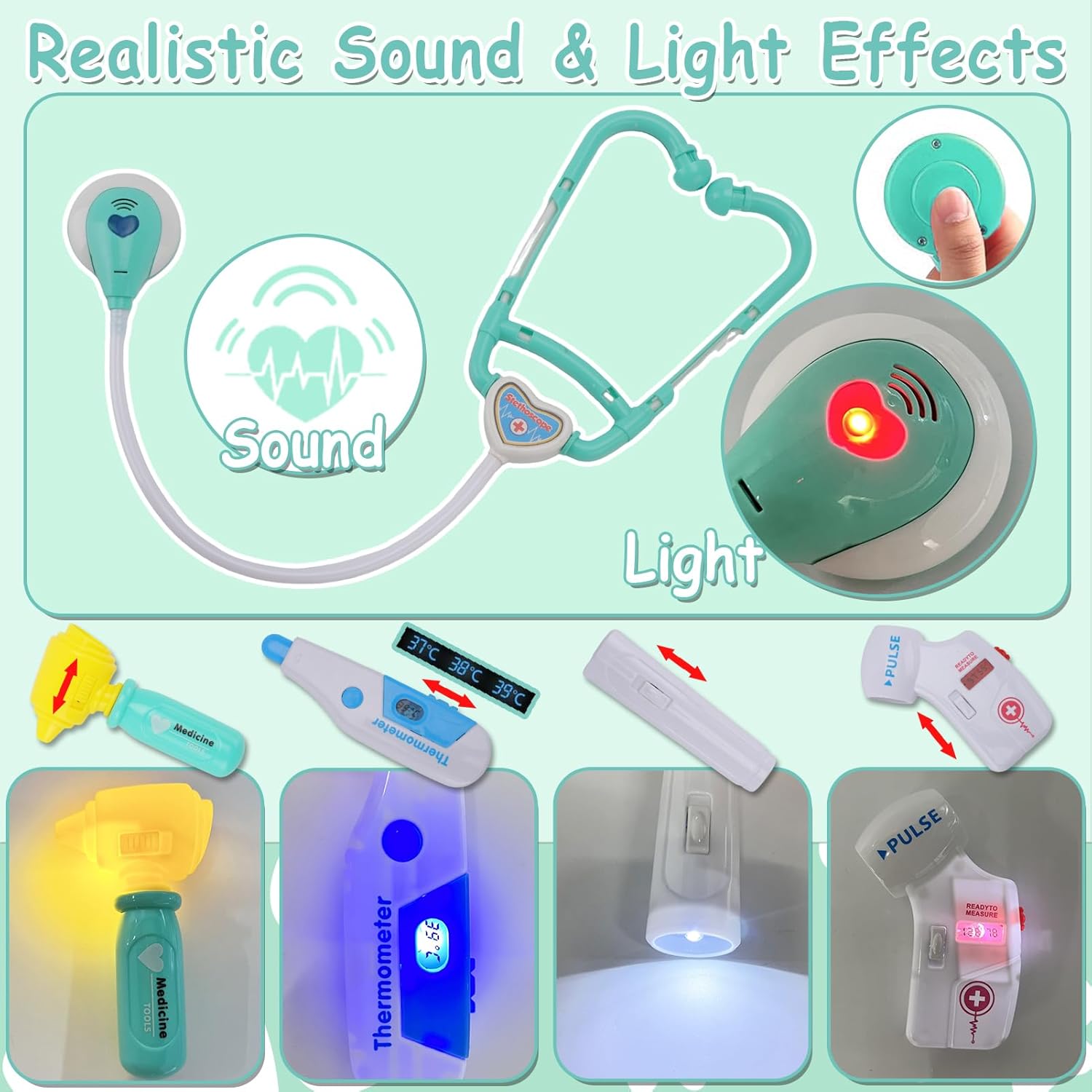 - Superior Pretend Play Toys for Kids: It is a fun and creative pretend play game with simulated medical tools and realistic nurse dress up costume. Take temperature with thermometer and listen to heartbeat with stethoscope with light brings more fun and sparks children`s imagination. Watch your little nurse wearing adorable surgical shirts and hats to take care of her lovely baby dolls or animals