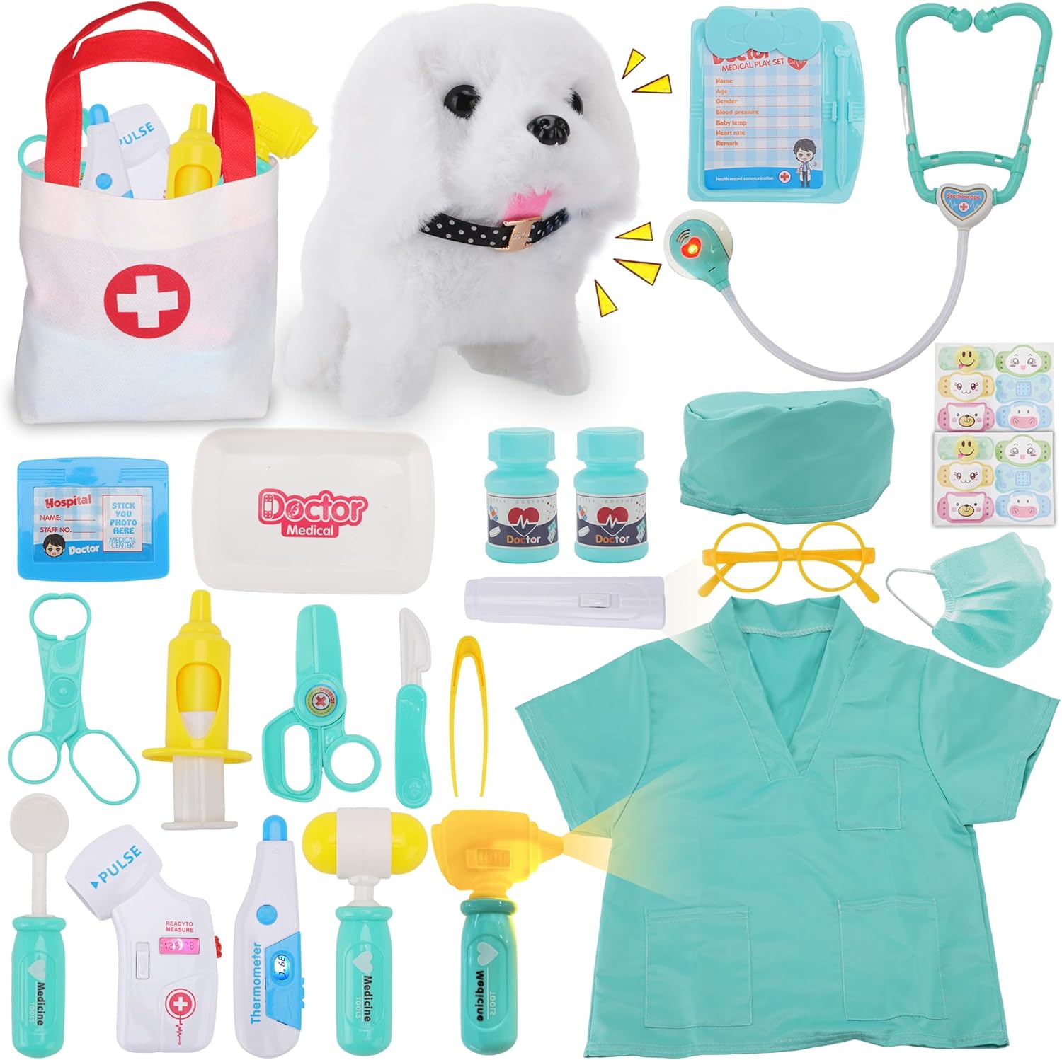 TEUVO Toy Doctor Kit for Girls - Pretend Play Doctor Set with Dog Toy, Carrying Bag & Stethoscope & Dress Up Costume - Toys Doctor Play Gift for Kids Toddlers Ages 1 2 3 4 5 6 7 Year Old for Role Play