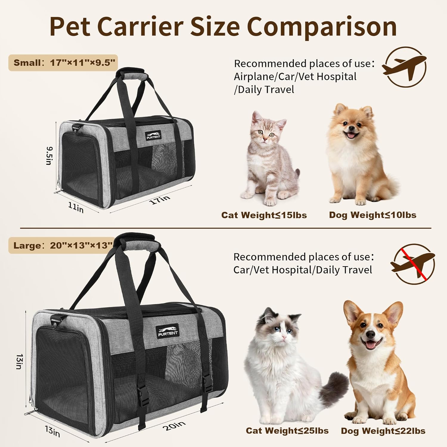- Airline Approved for Hassle-Free Travel: Our airline-approved pet carrier size 17.7"L x 11"W x 9.5"H, is designed to fit comfortably under most airline seats. Perfect for small cats and dogs, it guarantees an enjoyable travel experience without the usual worries of compliance. It is mainly designed for: American airlines(19x13x9"), United airlines(18x11x11"), Air Canda(21.5x15.5x 9"), Alaska airlines(17x11x11"), Delta airlines(21.5x15.5x10.5").